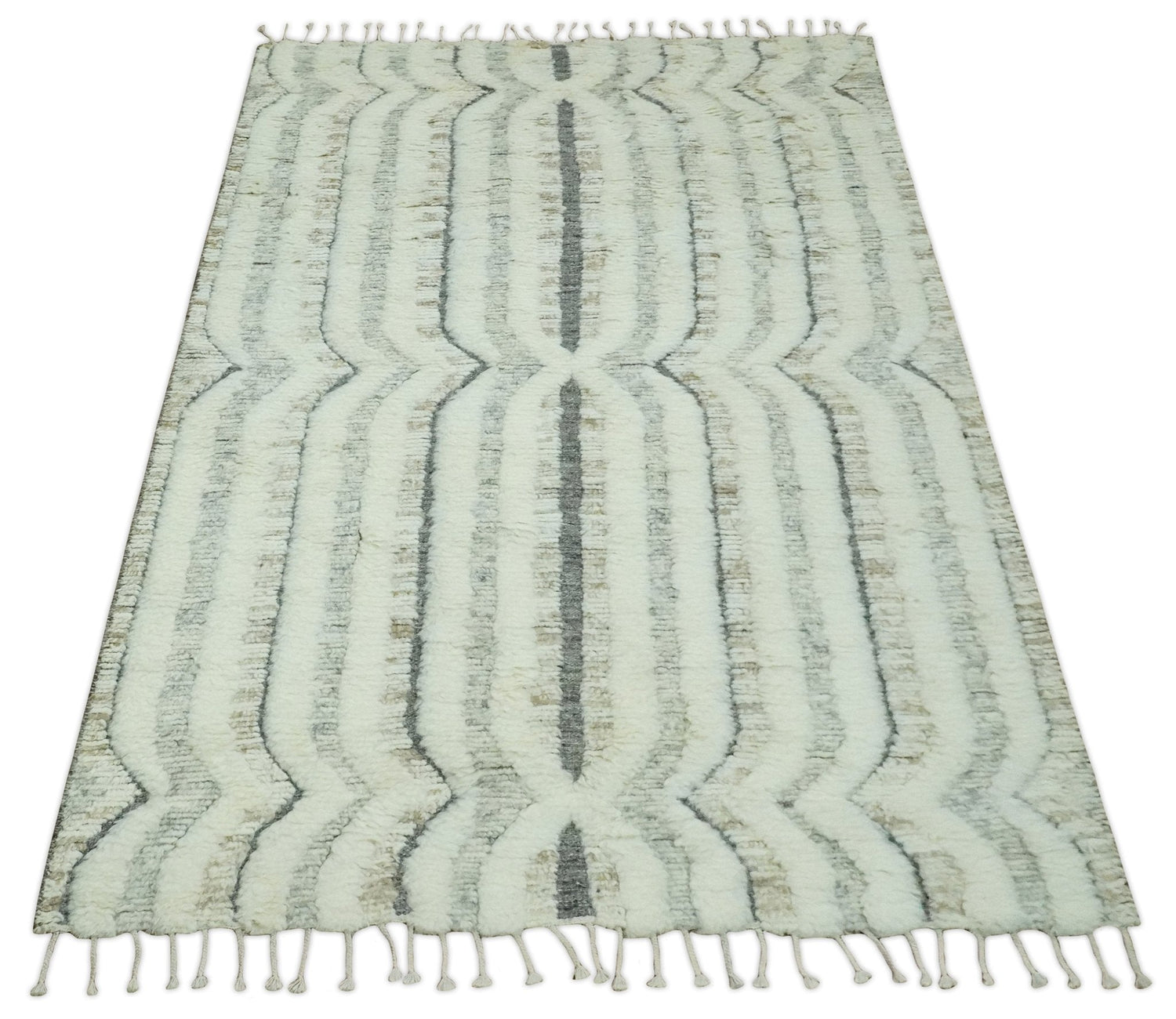 Hand Carved Texture Ivory, Gray, Charcoal and Beige Moroccan Style Modern Stripes Design 5x8 wool Area Rug