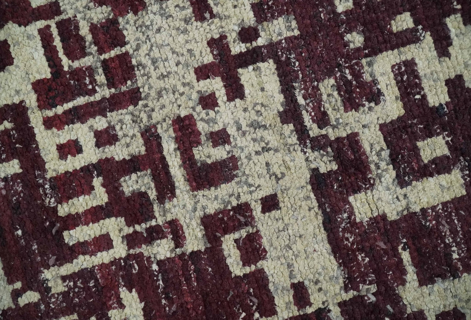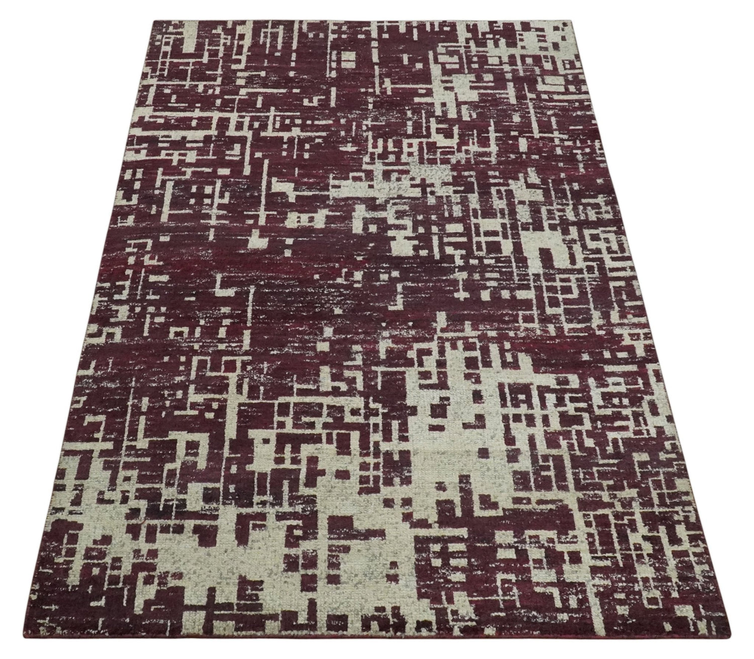 Hand Knotted 5x8 Maroon and Ivory Modern Abstract Contemporary Recycled Silk Area Rug