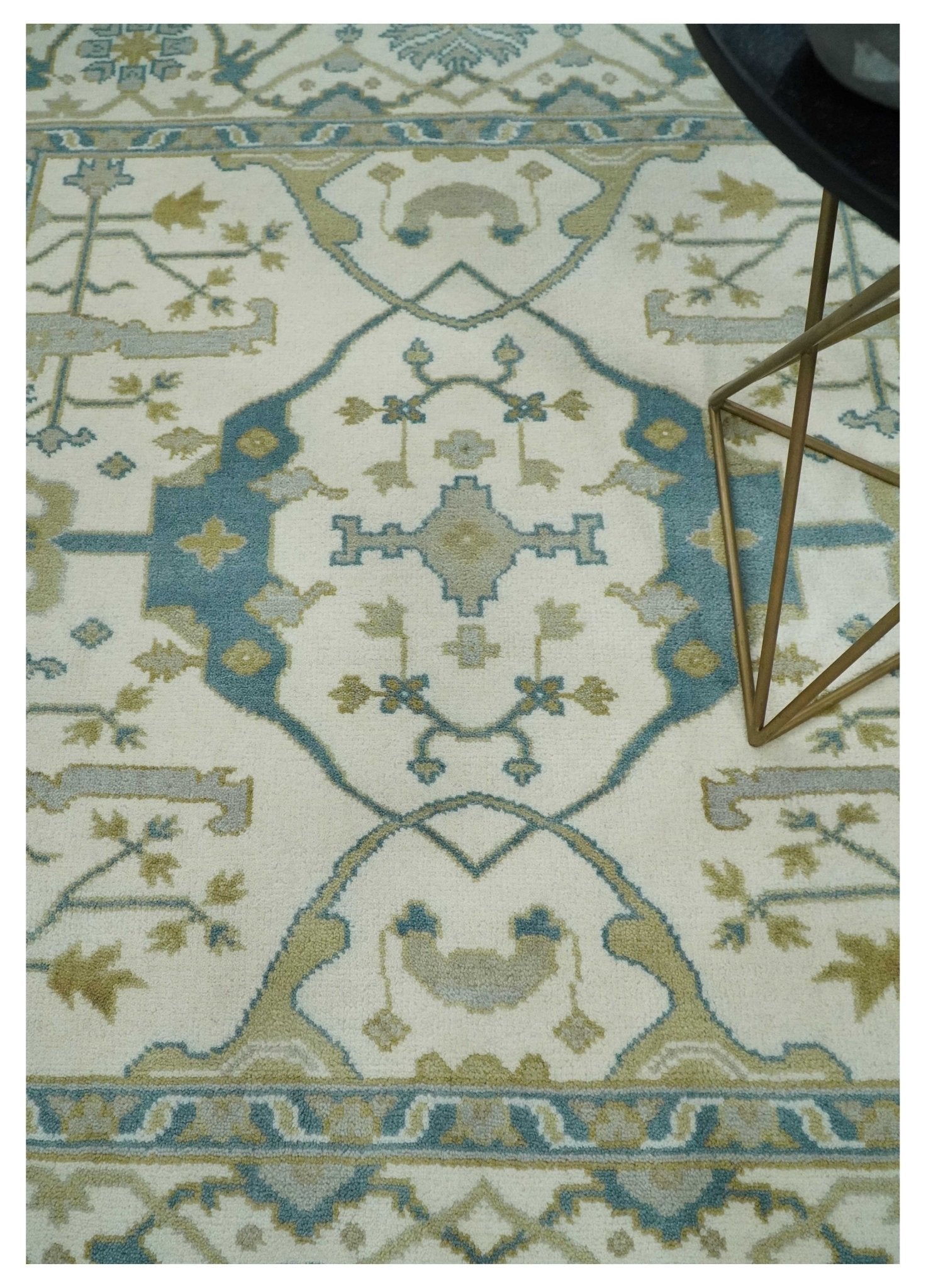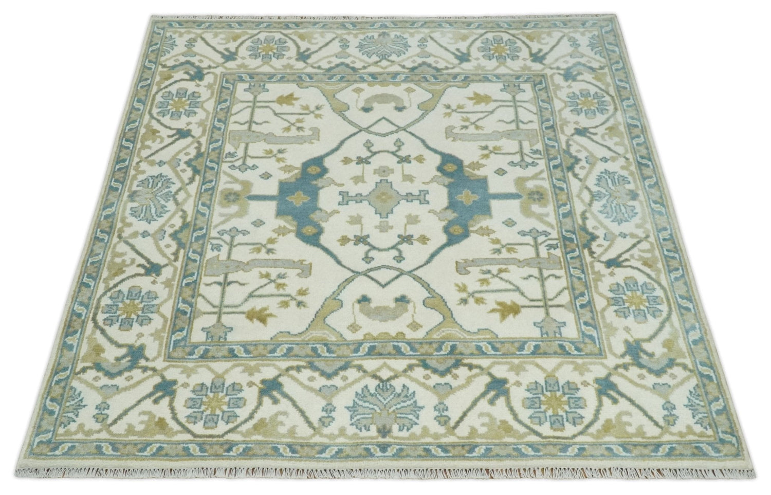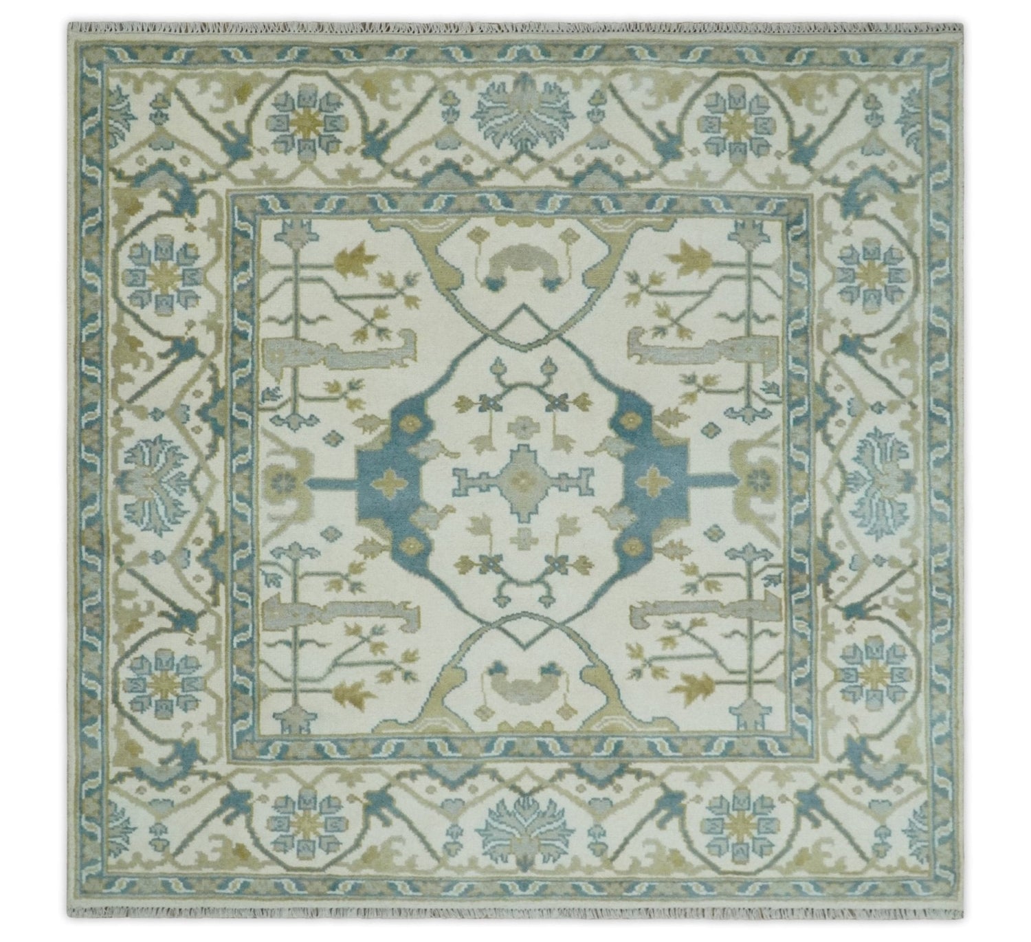 Hand Knotted 6x6 Square Oriental Oushak Ivory, Teal and Beige Wool Area Rug - 6x6 square is backordered and will ship as soon as it is back in stock.