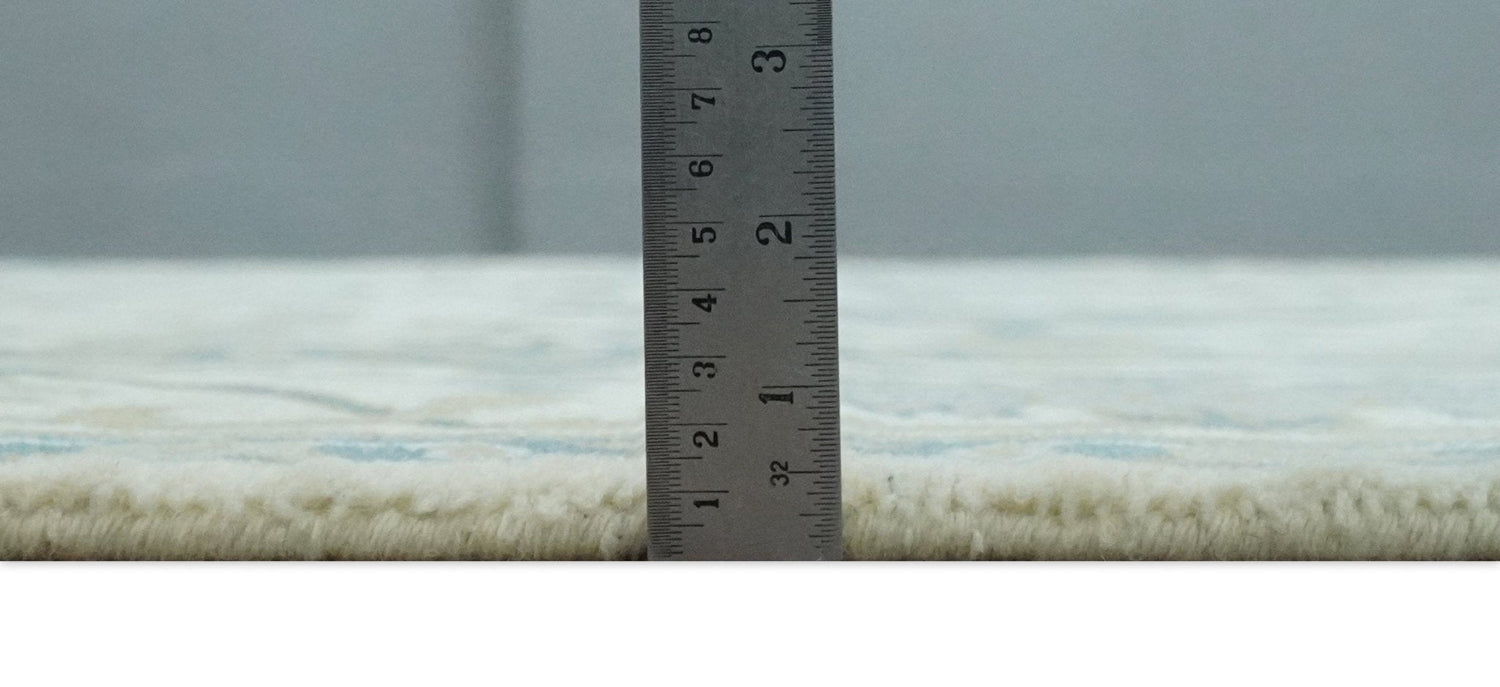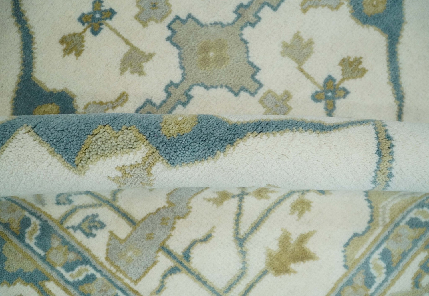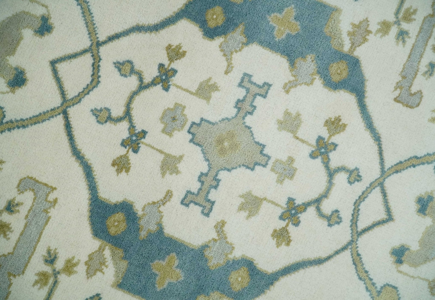 The Oriental Oushak design with a classic color combination of Ivory, Teal and Beige gives it an antique look. The rug is made with fine Wool. It is a perfect pick to give your interior a classic feel.