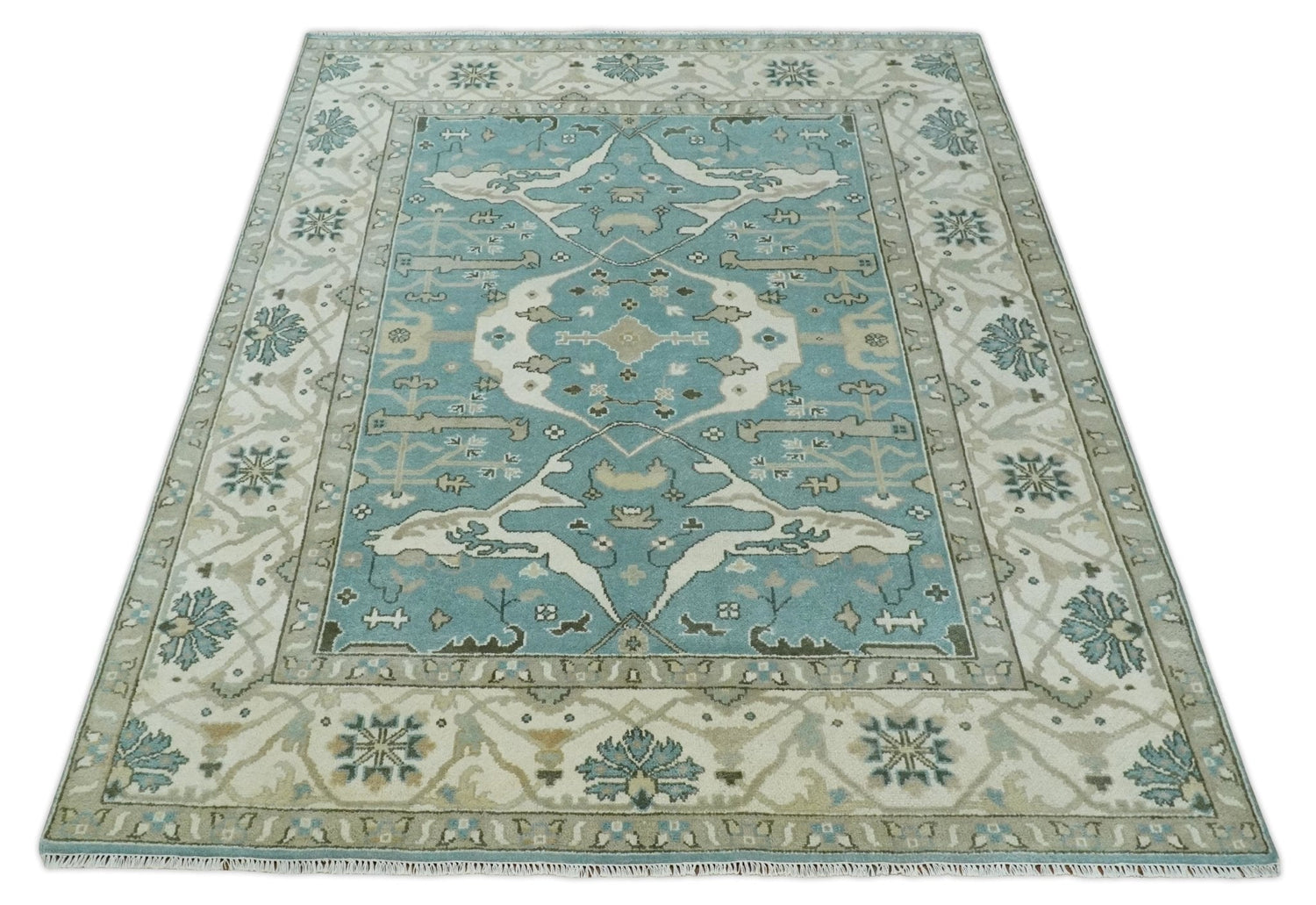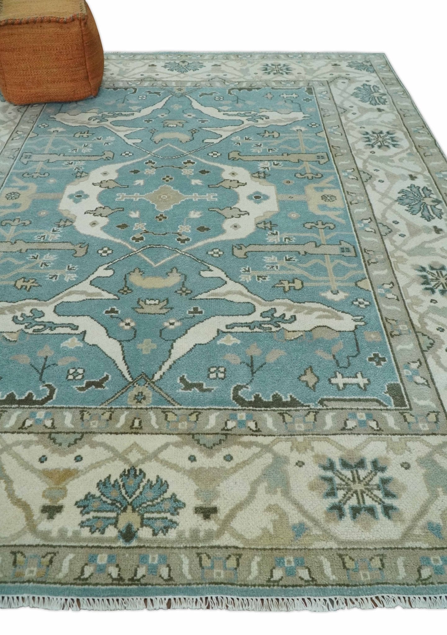 Hand Knotted 8x10 Oriental Oushak Aqua, Ivory and Silver Wool Area Rug | TRDCP1199810