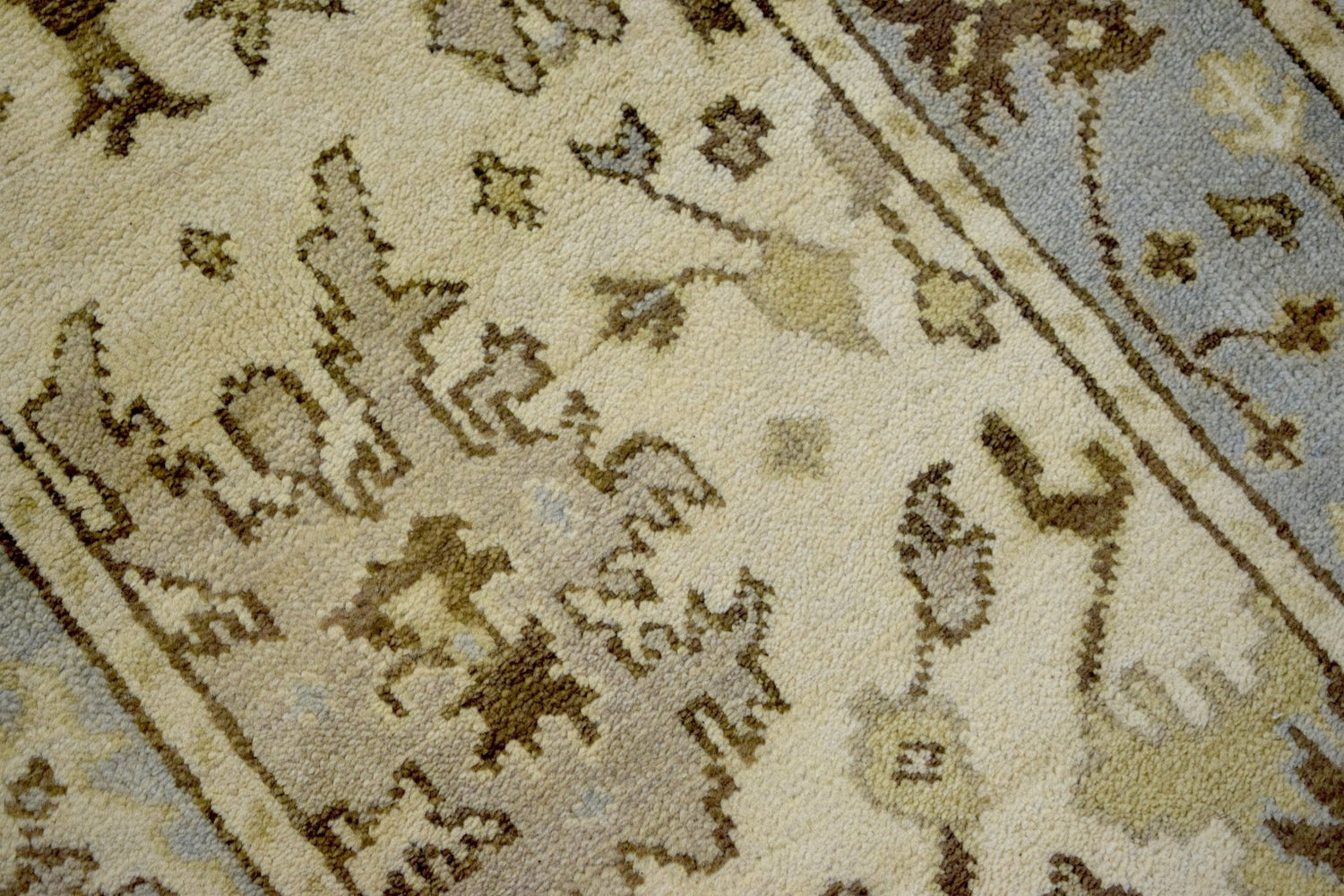 Hand Knotted Beige and Blue Antique Oushak Wool Runner Rug