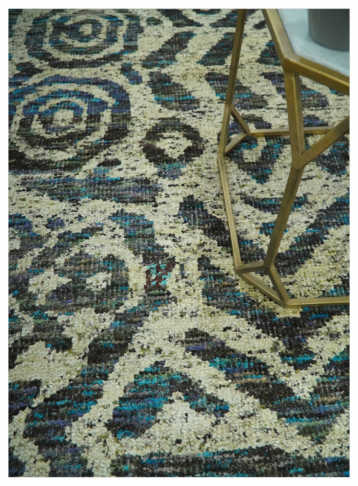 Hand Knotted Beige, Charcoal and Blue Antique Design Contemporary Recycled Silk Rug
