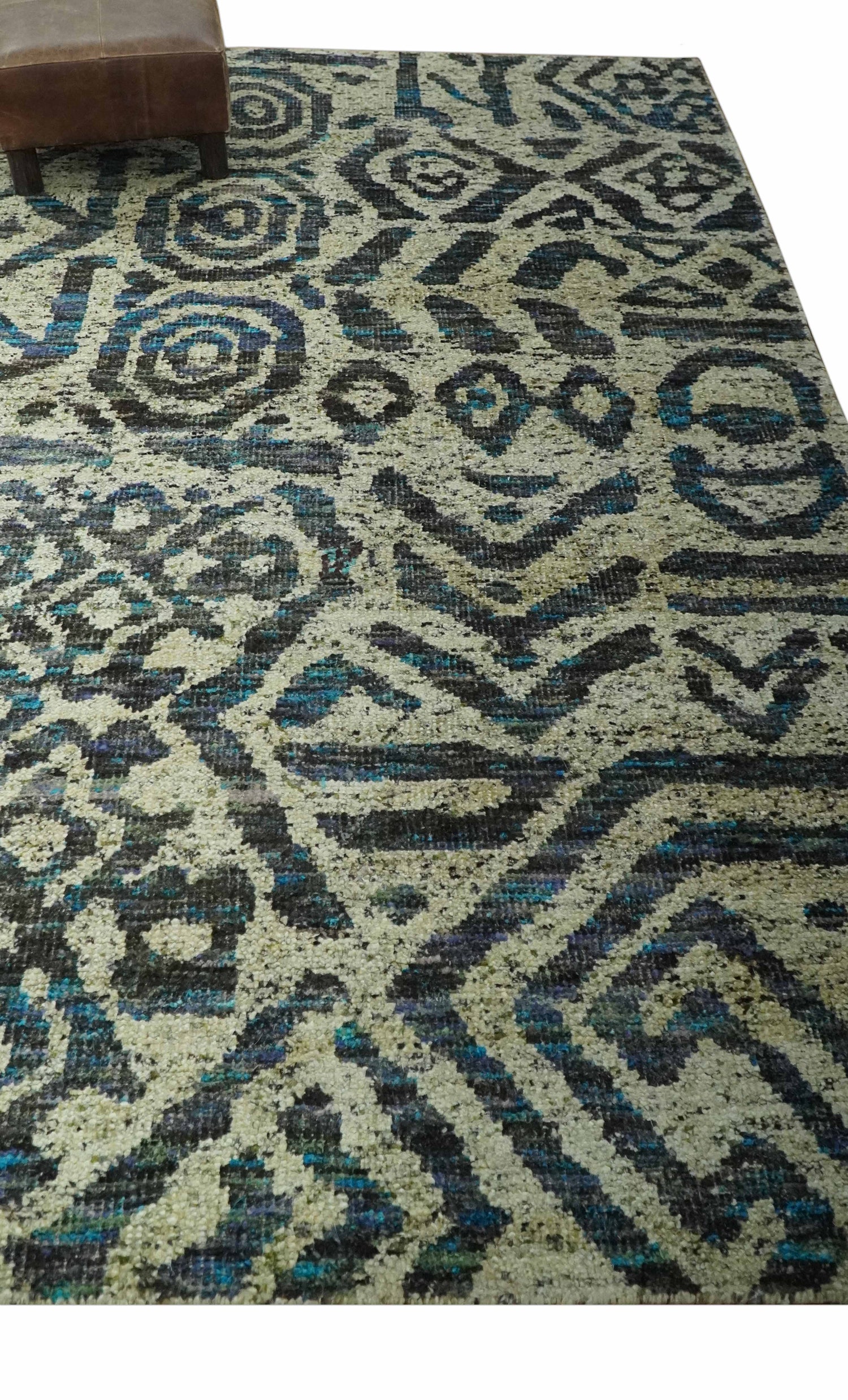 Hand Knotted Beige, Charcoal and Blue Antique Design Contemporary Recycled Silk Rug - 5x8 is backordered and will ship as soon as it is back in stock.
