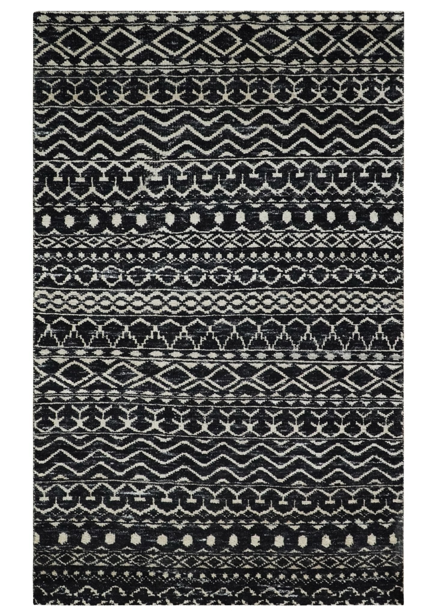 Hand Knotted Black and Ivory Modern Contemporary Tribal Trellis Recycled Silk Area Rug - 5x8 is backordered and will ship as soon as it is back in stock.