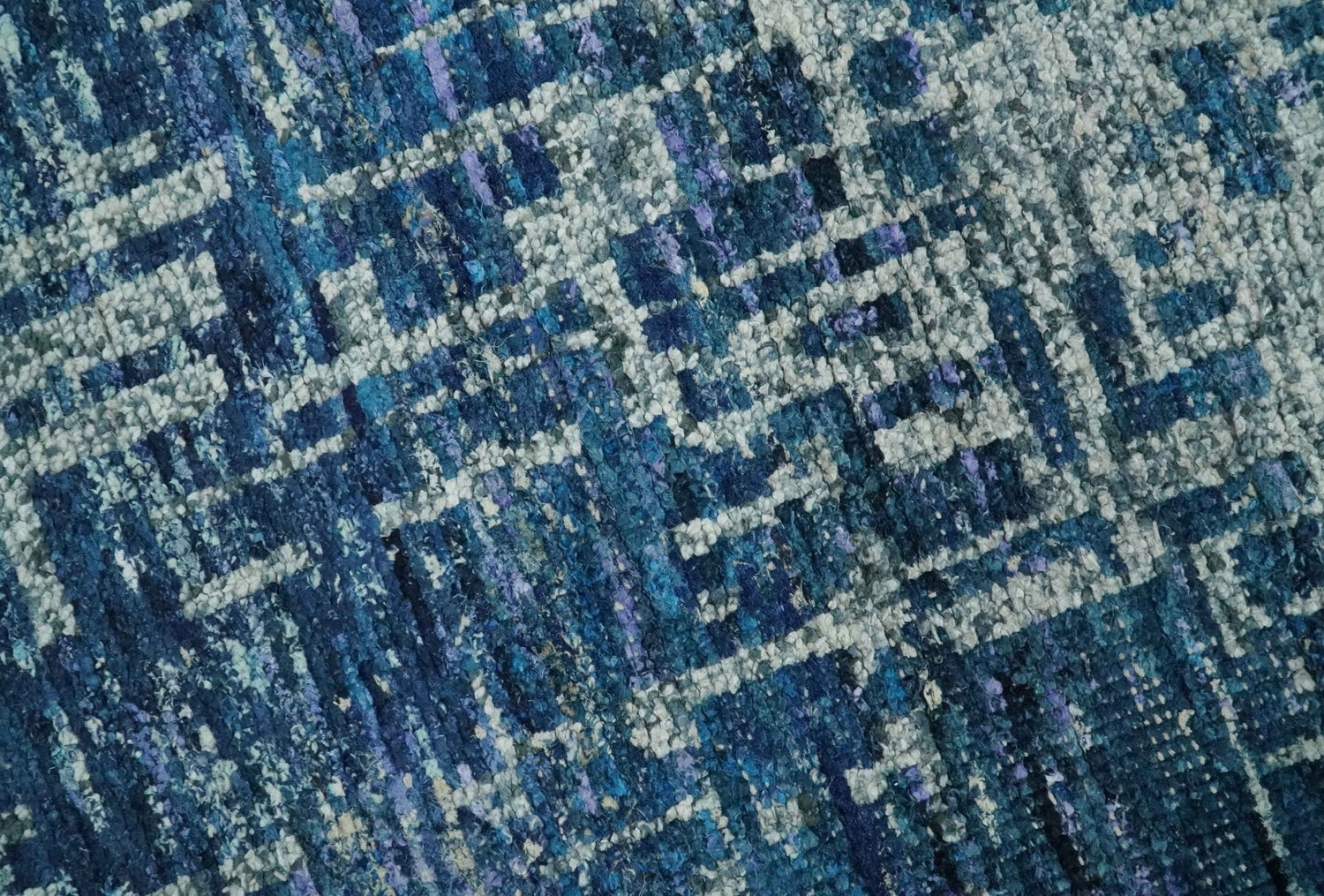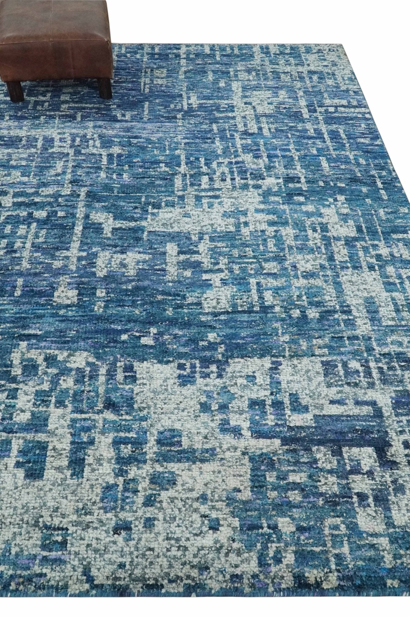 Hand Knotted Blue and Ivory Modern Abstract Contemporary Recycled Silk Area Rug
