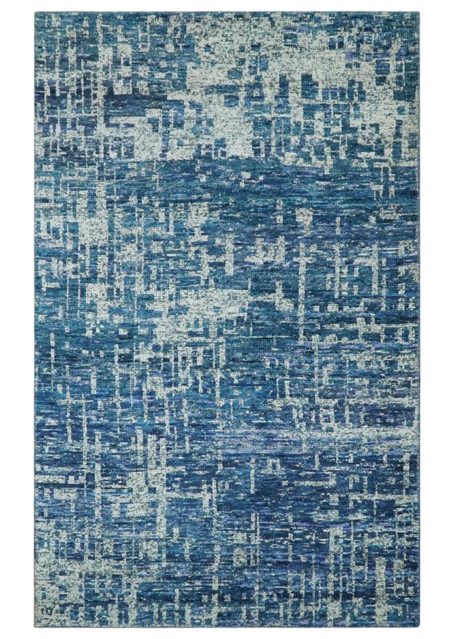Hand Knotted Blue and Ivory Modern Abstract Contemporary Recycled Silk Area Rug - 5x8 is backordered and will ship as soon as it is back in stock.