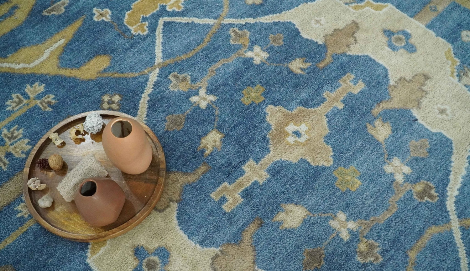 Hand Knotted Blue, Beige and Olive Oriental Oushak 8x10 Wool Area Rug - 8x10 is backordered and will ship as soon as it is back in stock.