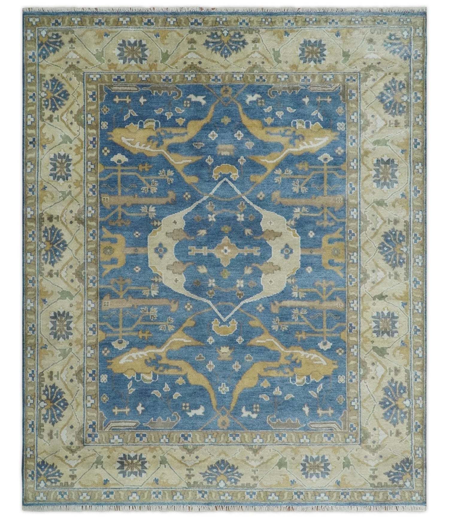 Hand Knotted Blue, Beige and Olive Oriental Oushak 8x10 Wool Area Rug