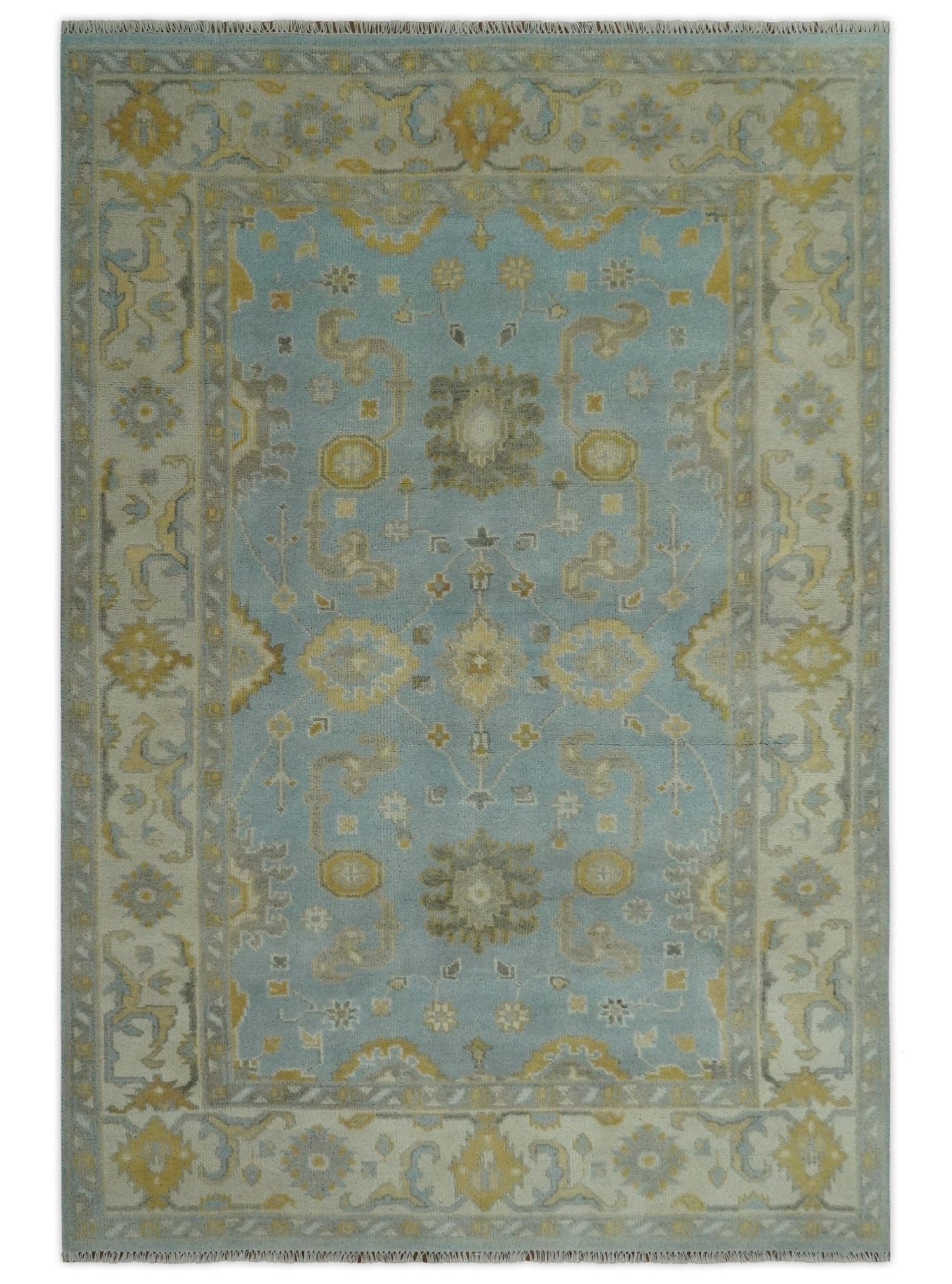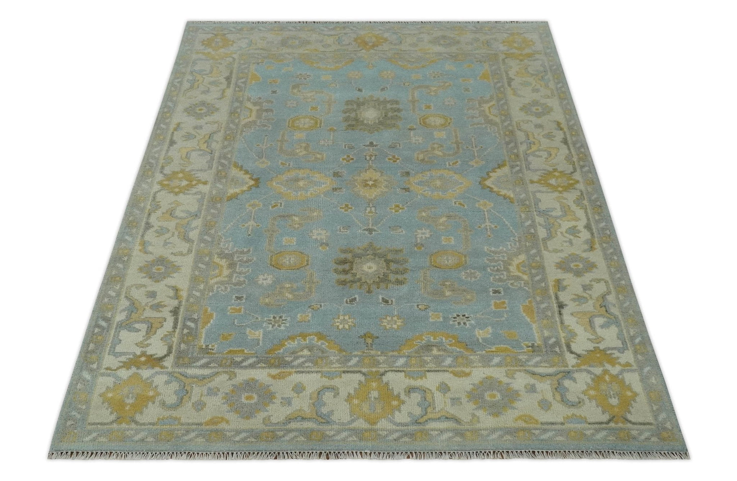 Hand Knotted Gray, Ivory and Mustard 6x8.8 Traditional Oriental Oushak wool rug - 6x8.8 is backordered and will ship as soon as it is back in stock.