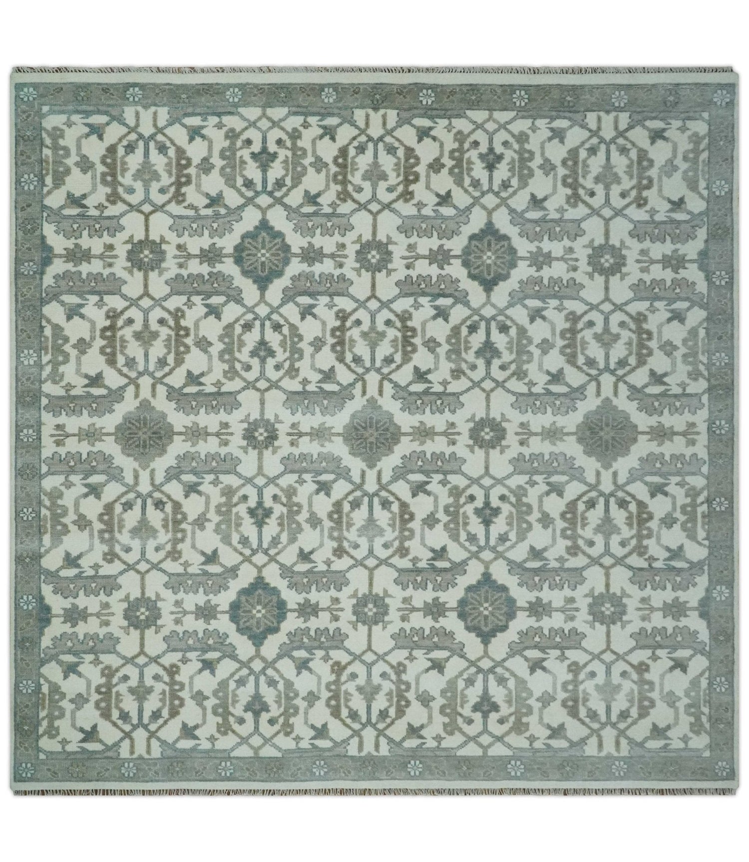 Hand Knotted Ivory and Teal 8x10 and 11x11 Square Oushak Wool Area Rug