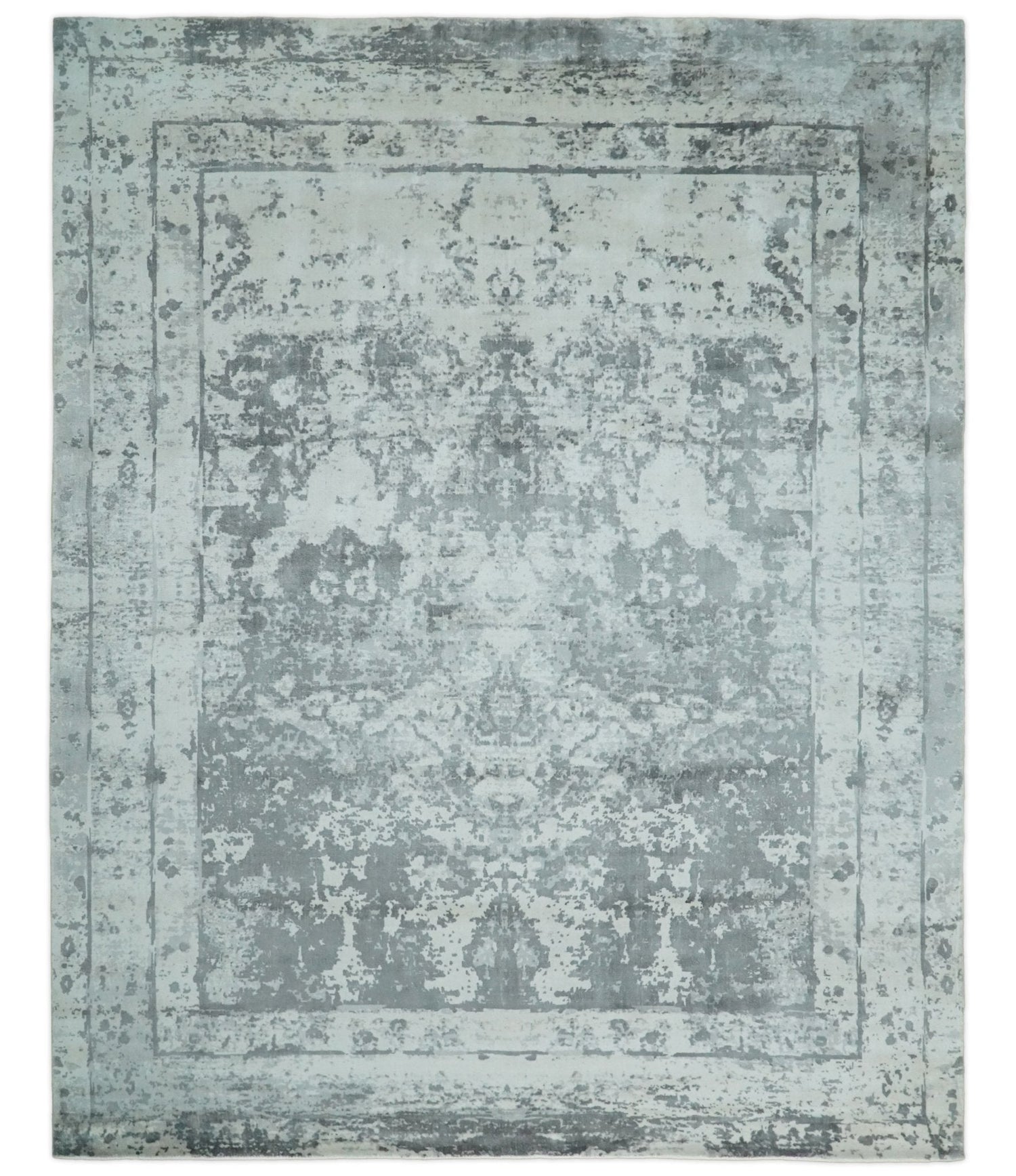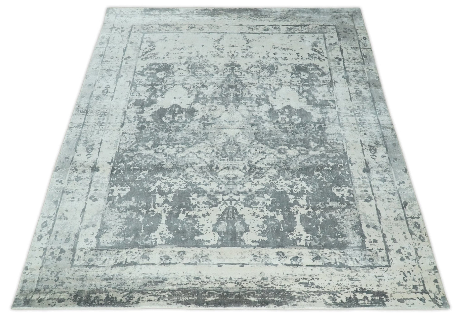 Handmade 7.10x9.9 Abstract Ivory and Gray Blended Wool and Bamboo Silk Area Rug