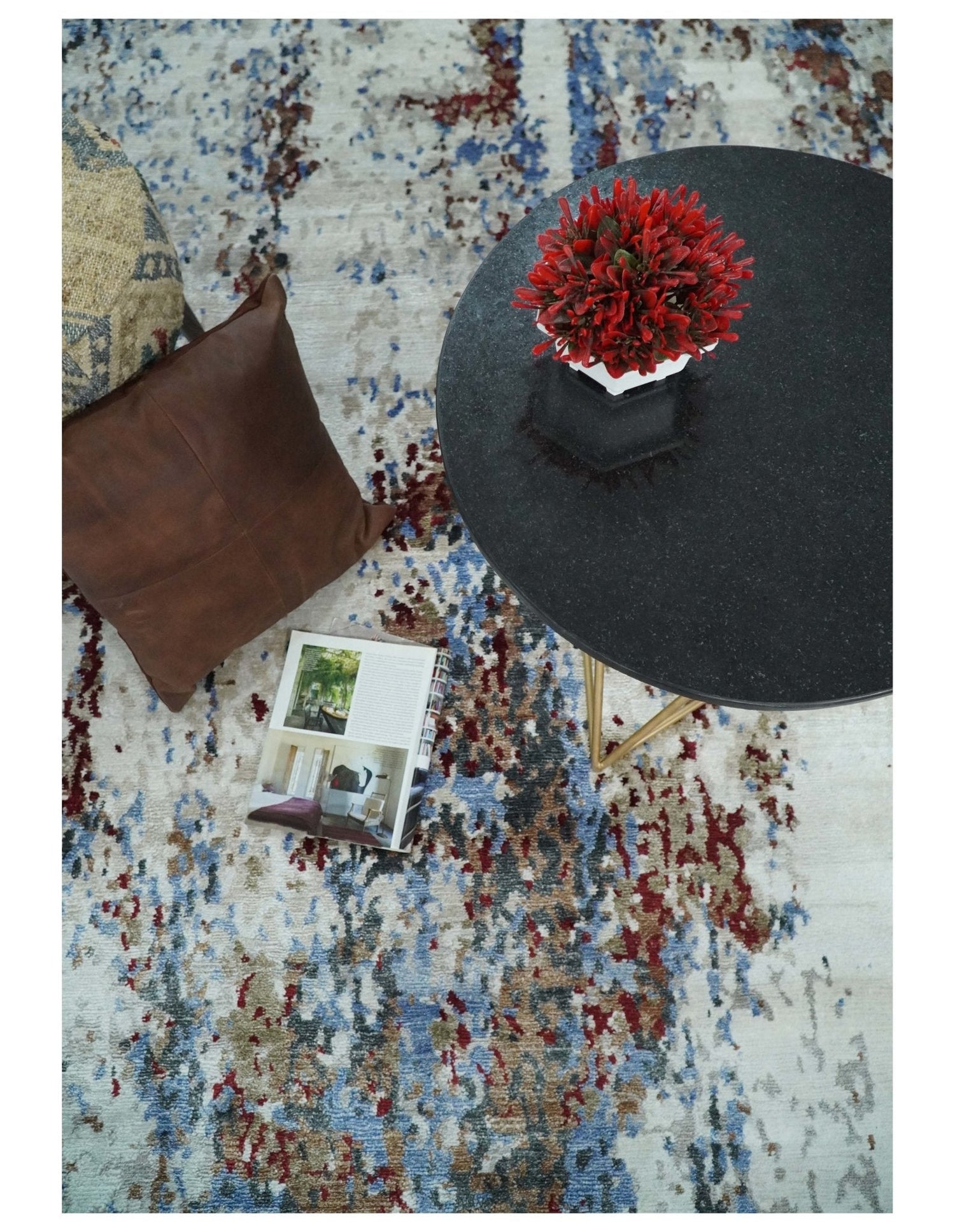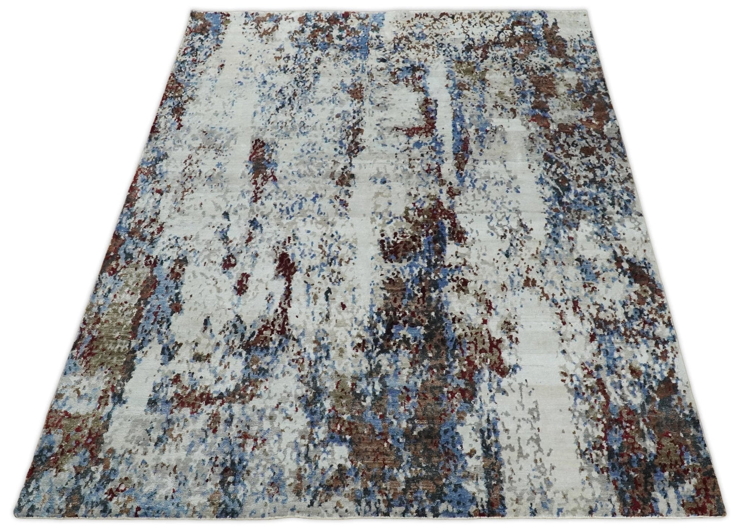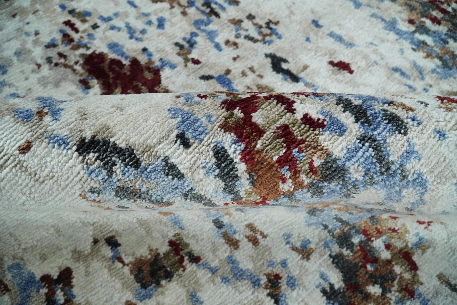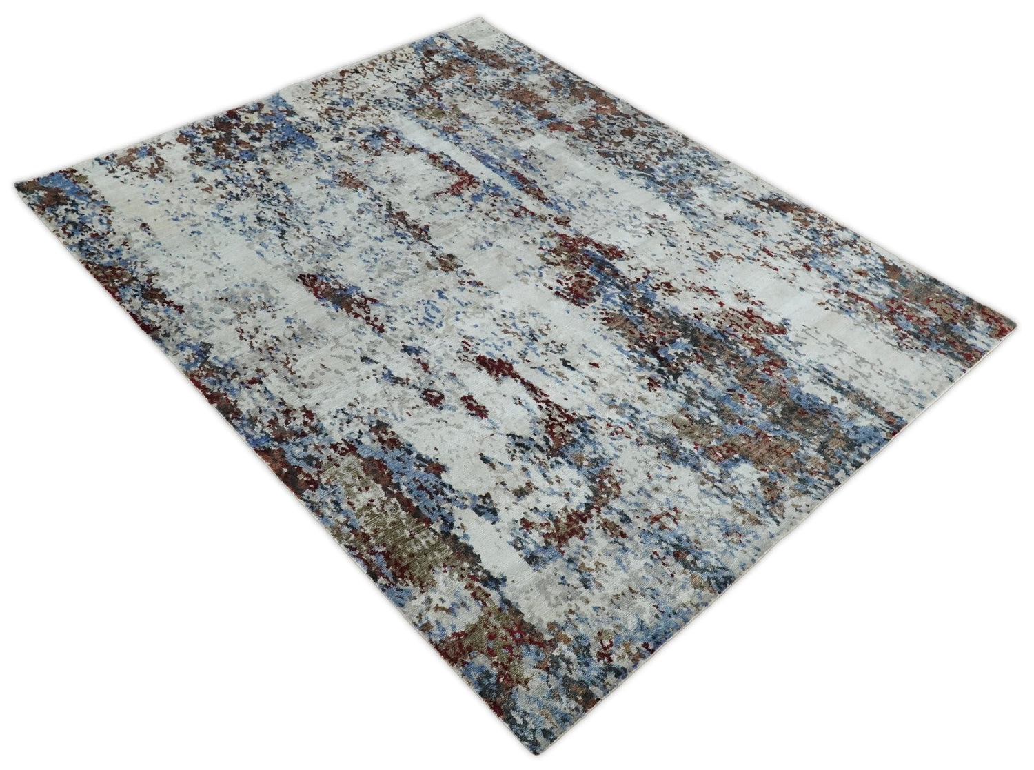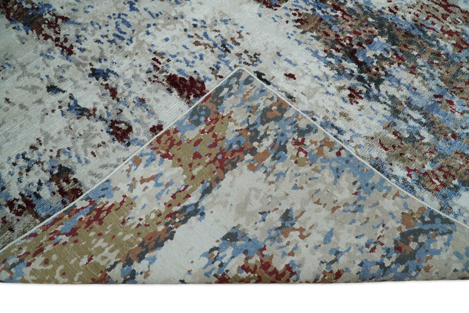 Handmade 8x10 Ivory, Blue and Red Abstract bamboo Silk Area Rug | TRDS2810