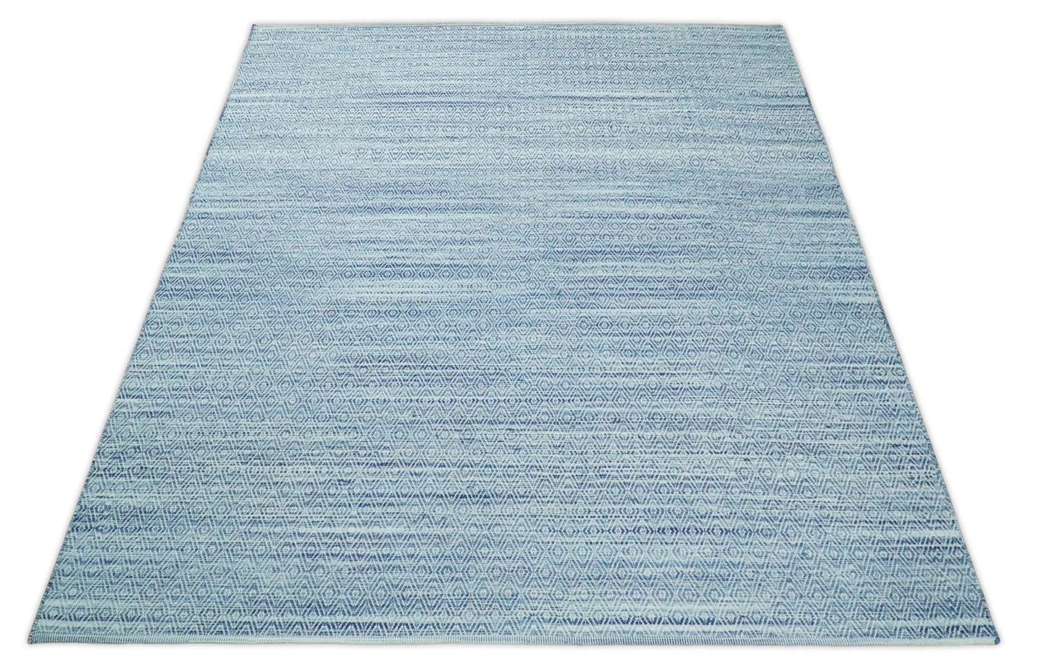 Handmade Boho 5x8 and 8x10 Ivory and Blue Wool Blend Dhurrie Rug | VIK3