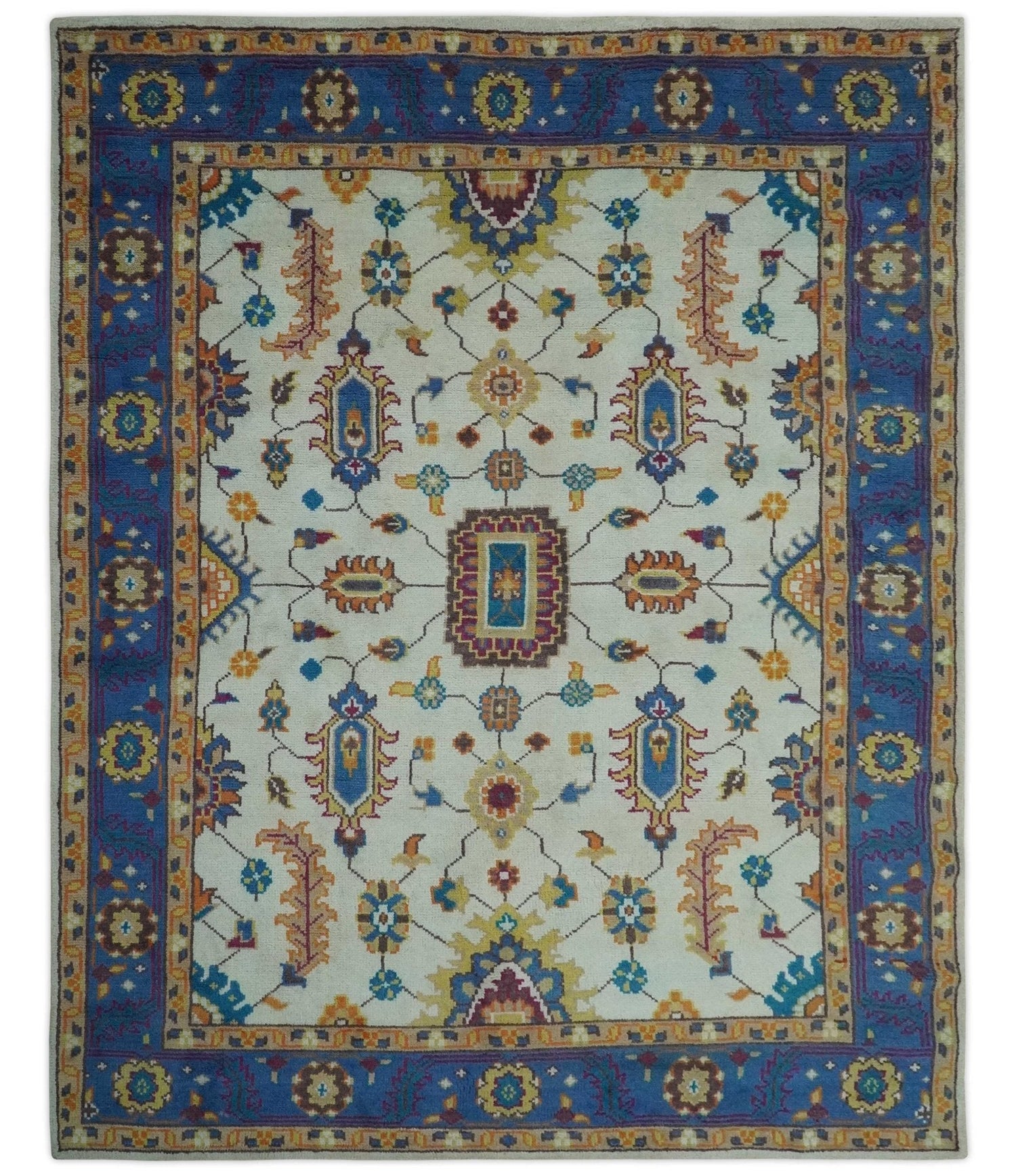 Ivory and Blue Hand Knotted Traditional Design 8x10 wool Area Rug