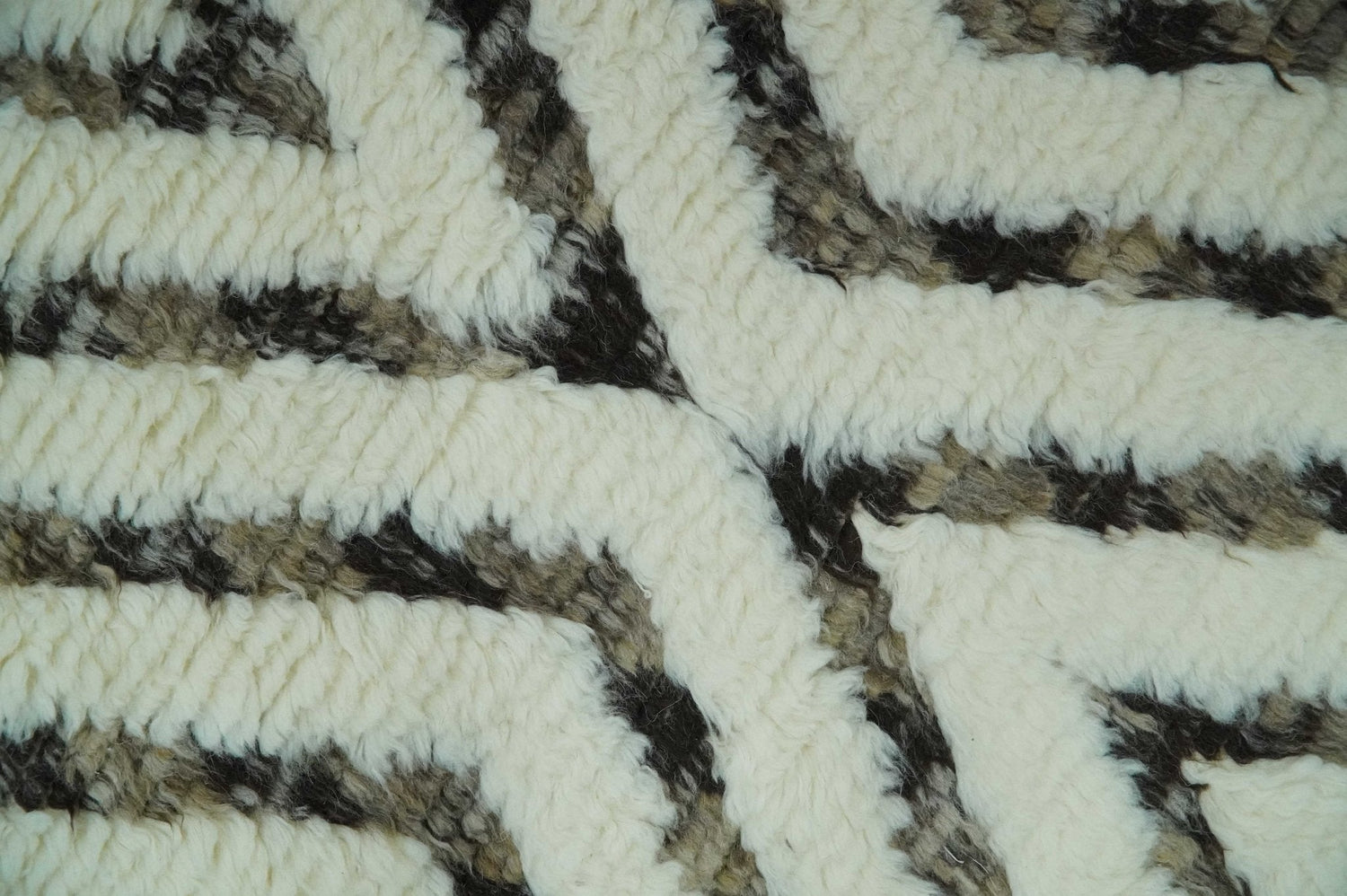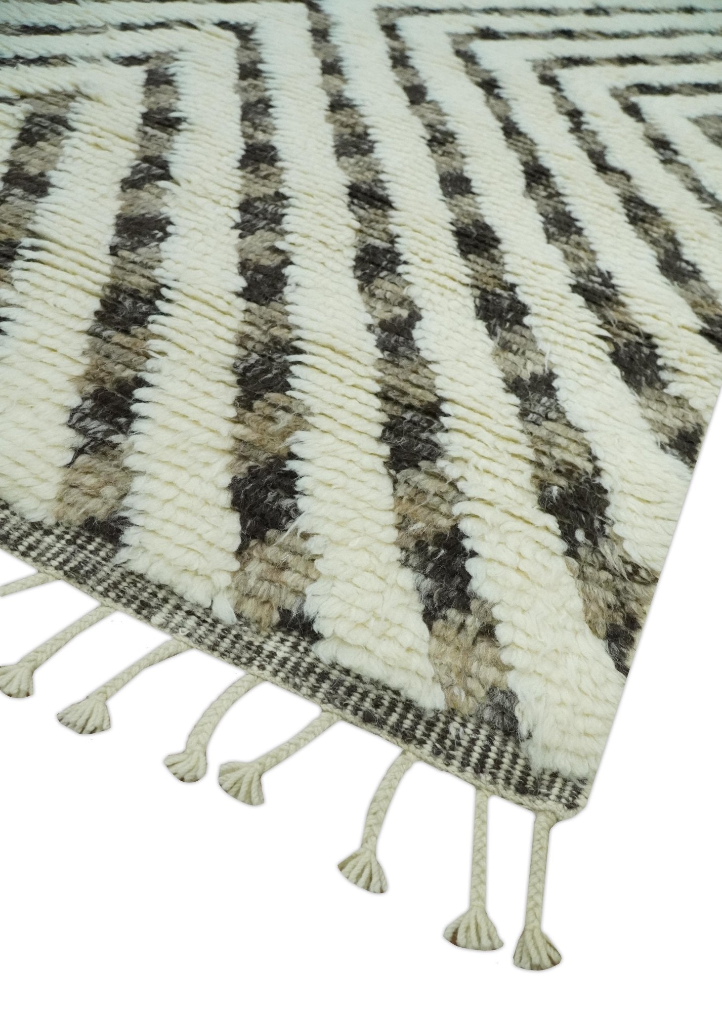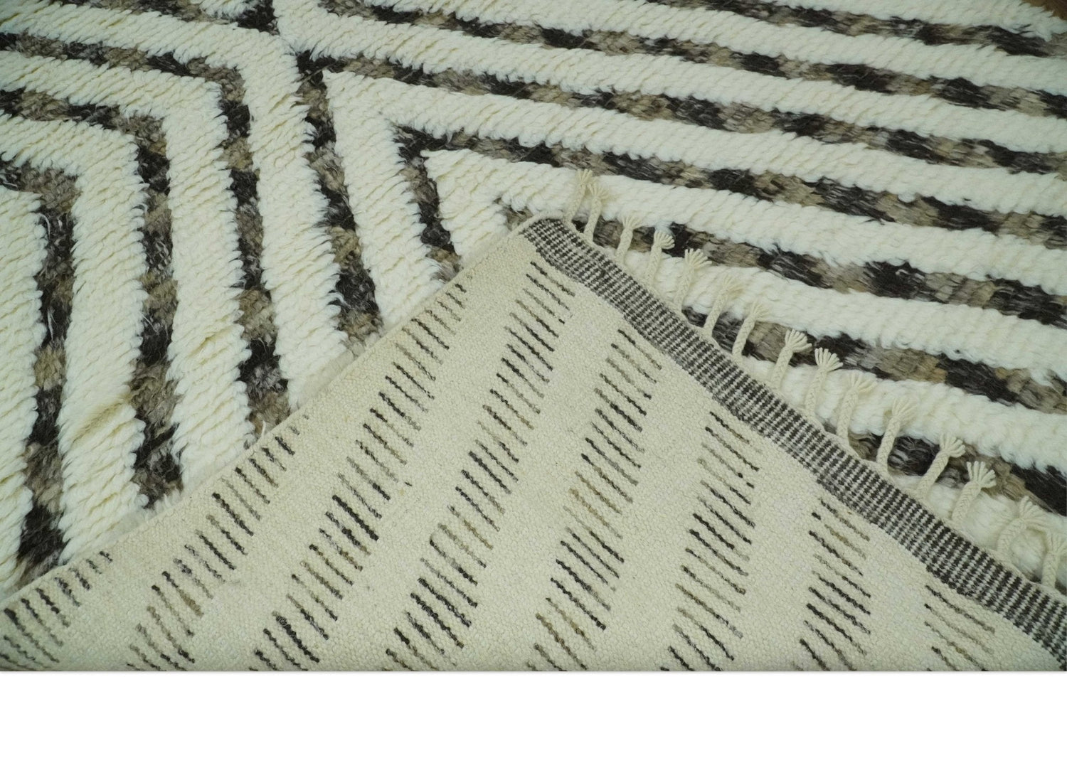 Ivory, Beige and Charcoal Modern Stripes Plush Pile Moroccan Style Hand knotted 5x8 wool Area Rug