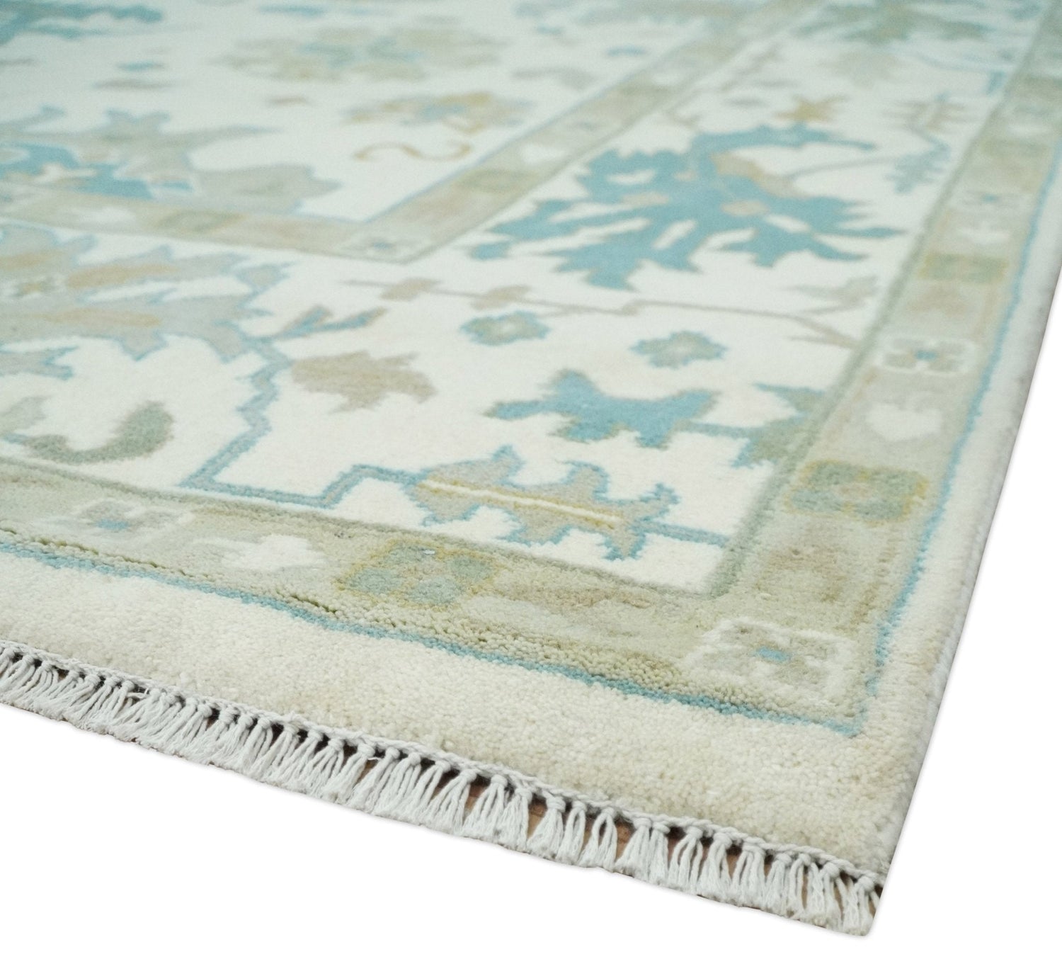 Ivory, Beige and Teal Hand Knotted Antique 9x13 Traditional Oushak Wool Rug - 8.8x13.1 is backordered and will ship as soon as it is back in stock.