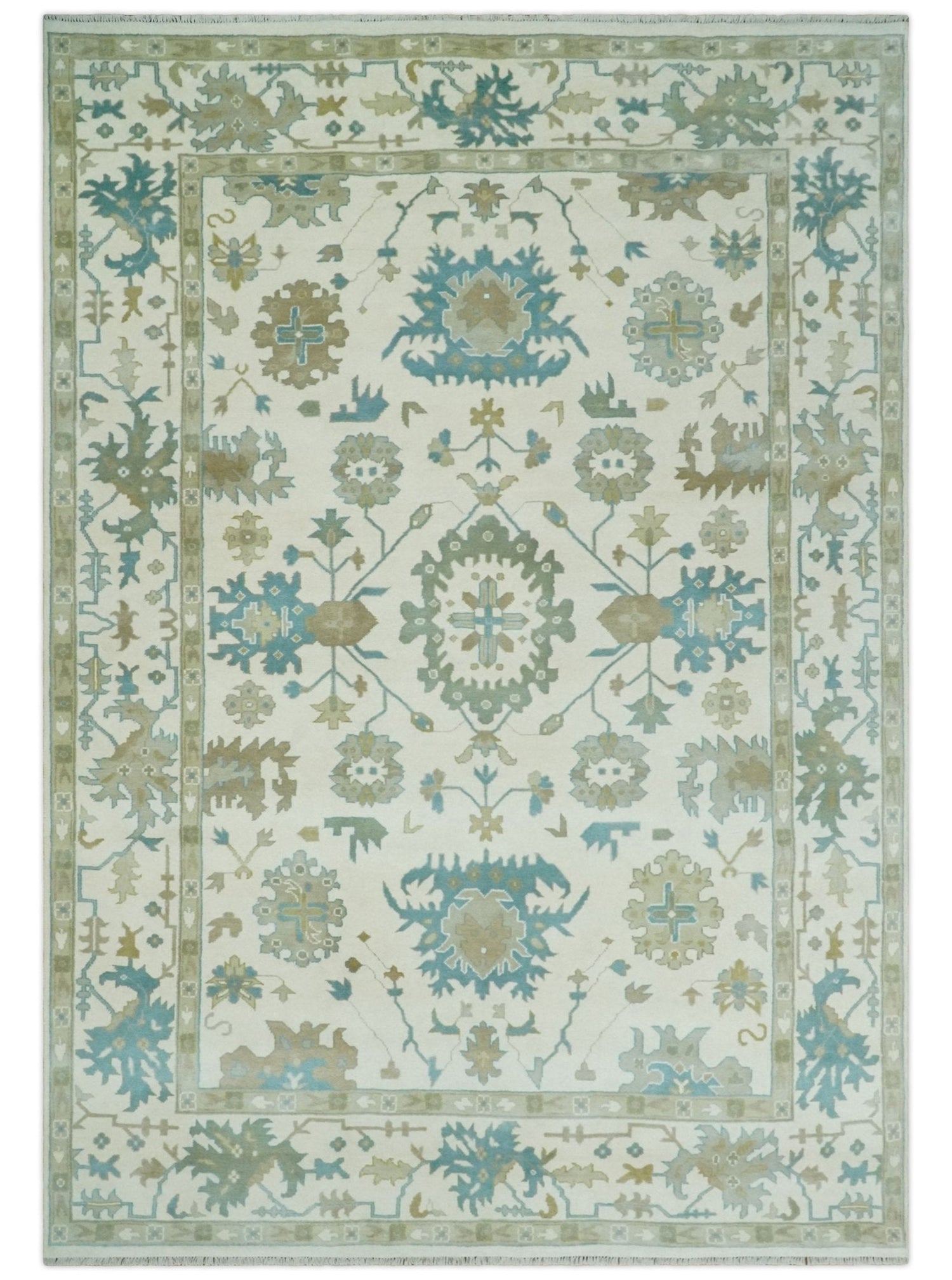 Ivory, Beige and Teal Hand Knotted Antique 9x13 Traditional Oushak Wool Rug