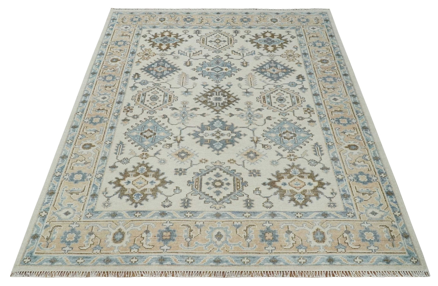 Ivory, Peach and Gray Hand knotted 8x10 Traditional Ikat Design Oushak wool Area Rug