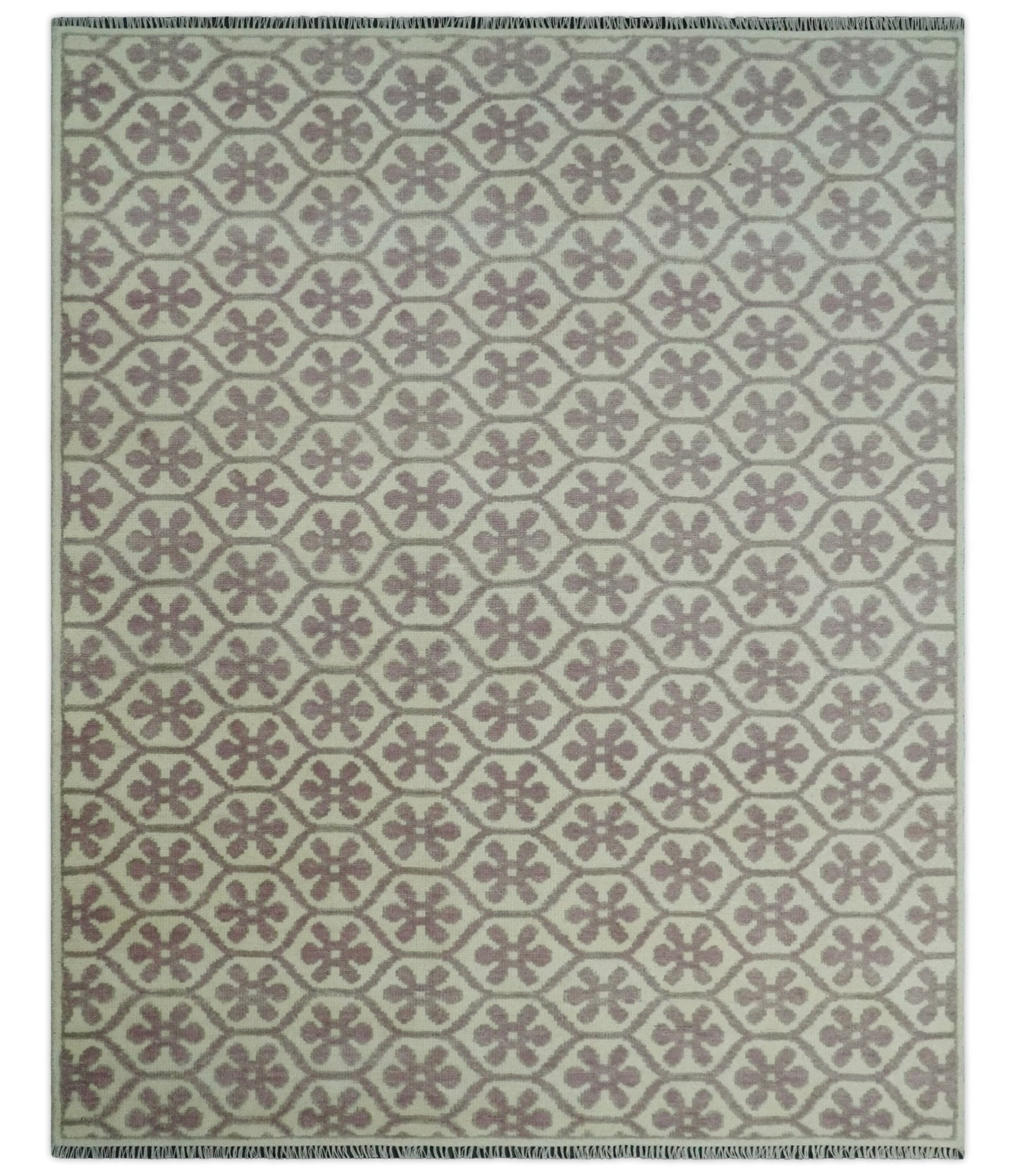 Expertly hand-knotted, this 8x10 wool area rug combines ivory, purple, and gray hues to create a striking geometrical floral design. The natural wool material provides both warmth and durability, making it a perfect addition to any living space.