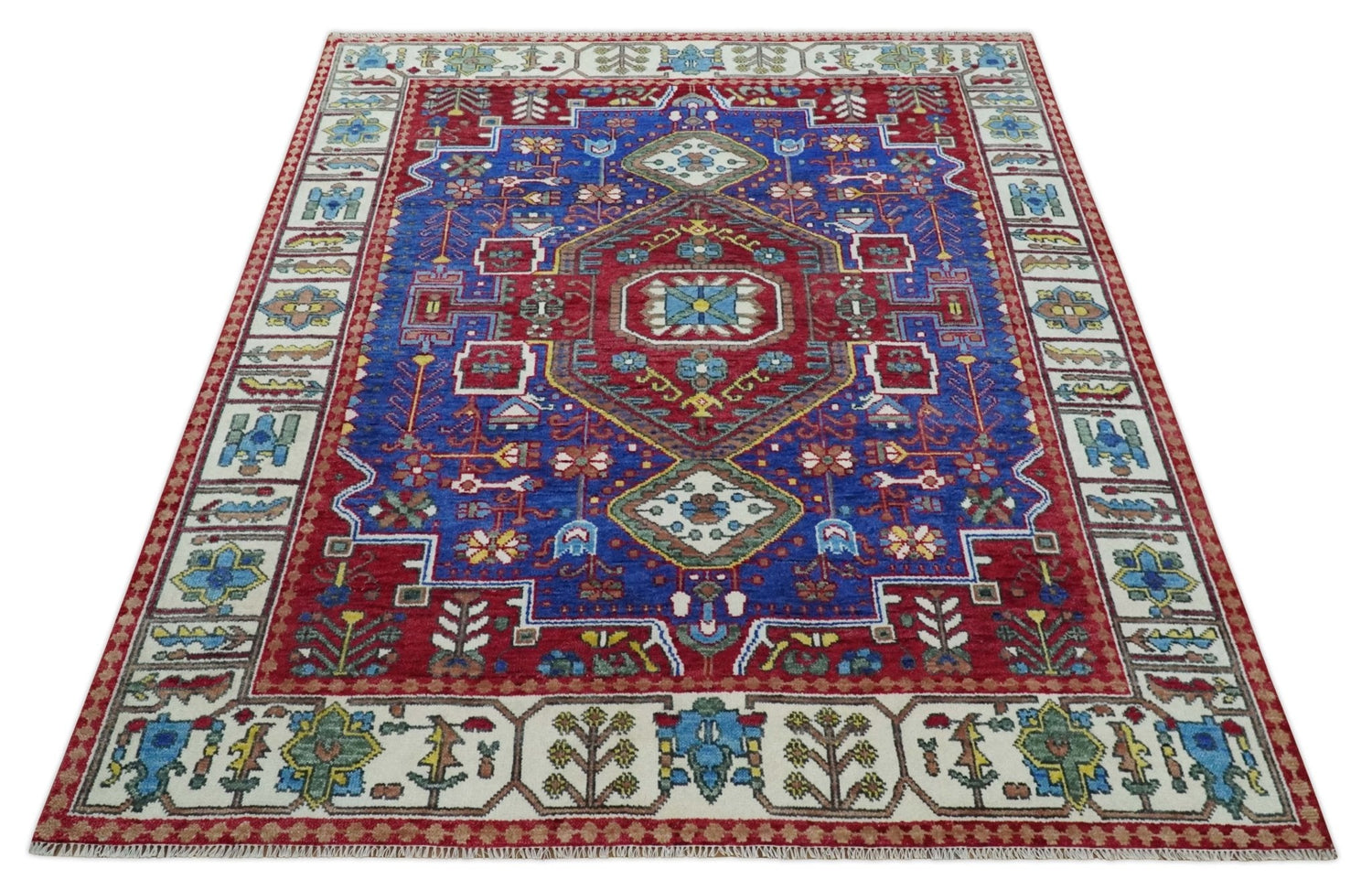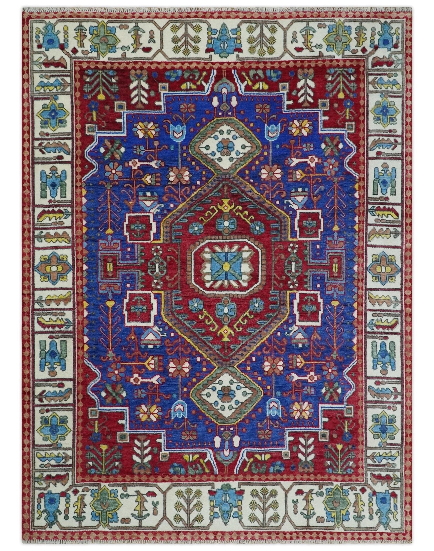 Maroon, Blue and ivory Hand Knotted Antique 8x10 Traditional Wool Rug