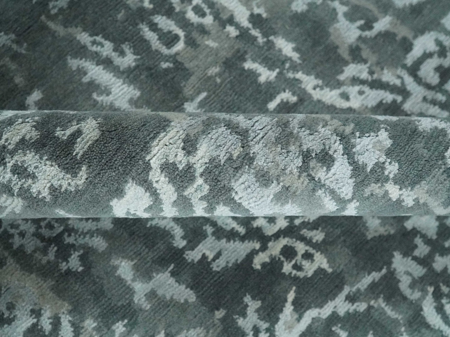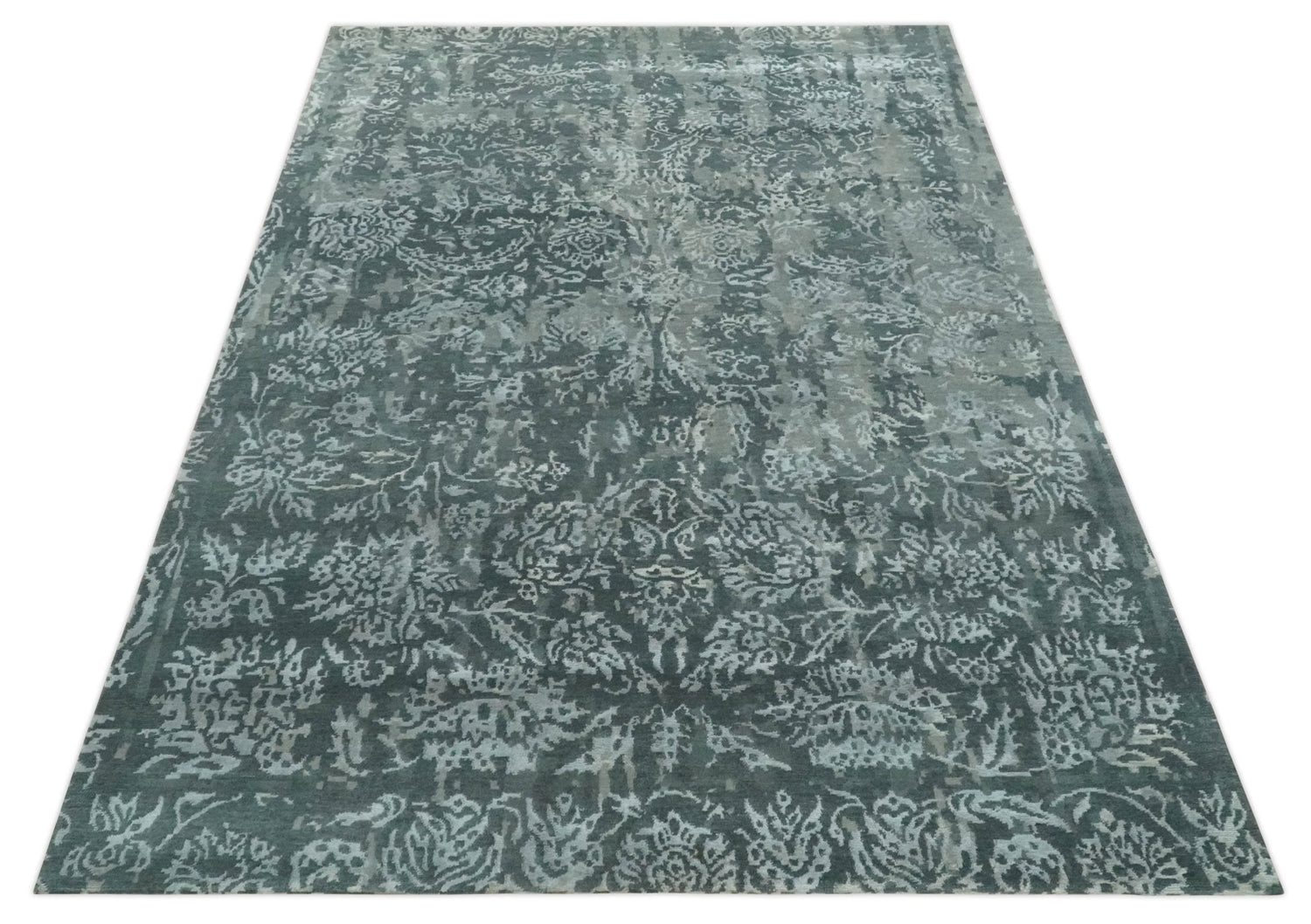 Modern Abstract Charcoal, Grey and Silver Hand Knotted 6x9.4 Floral Wool and Silk Area Rug - 6x9.4 is backordered and will ship as soon as it is back in stock.