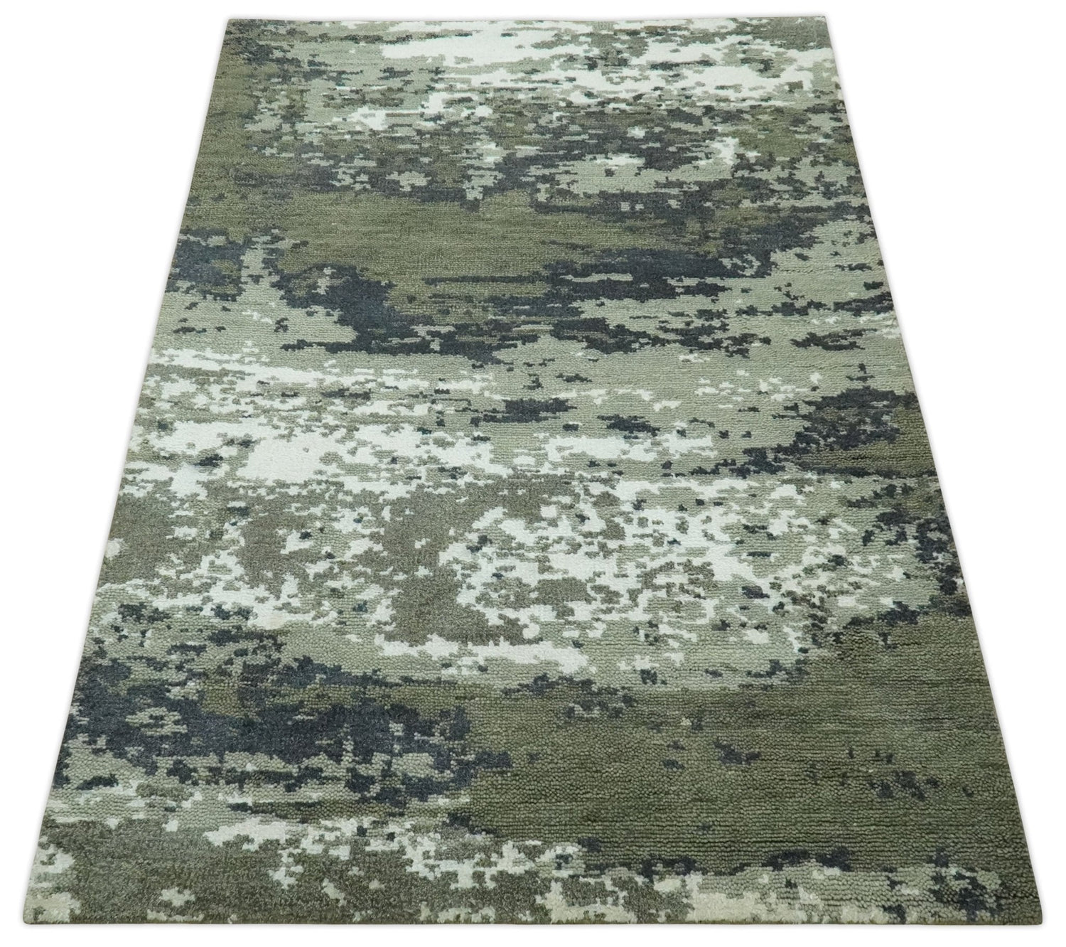 Modern abstract Green, Charcoal, Ivory and silver Hand Knotted 5x8 wool Area Rug