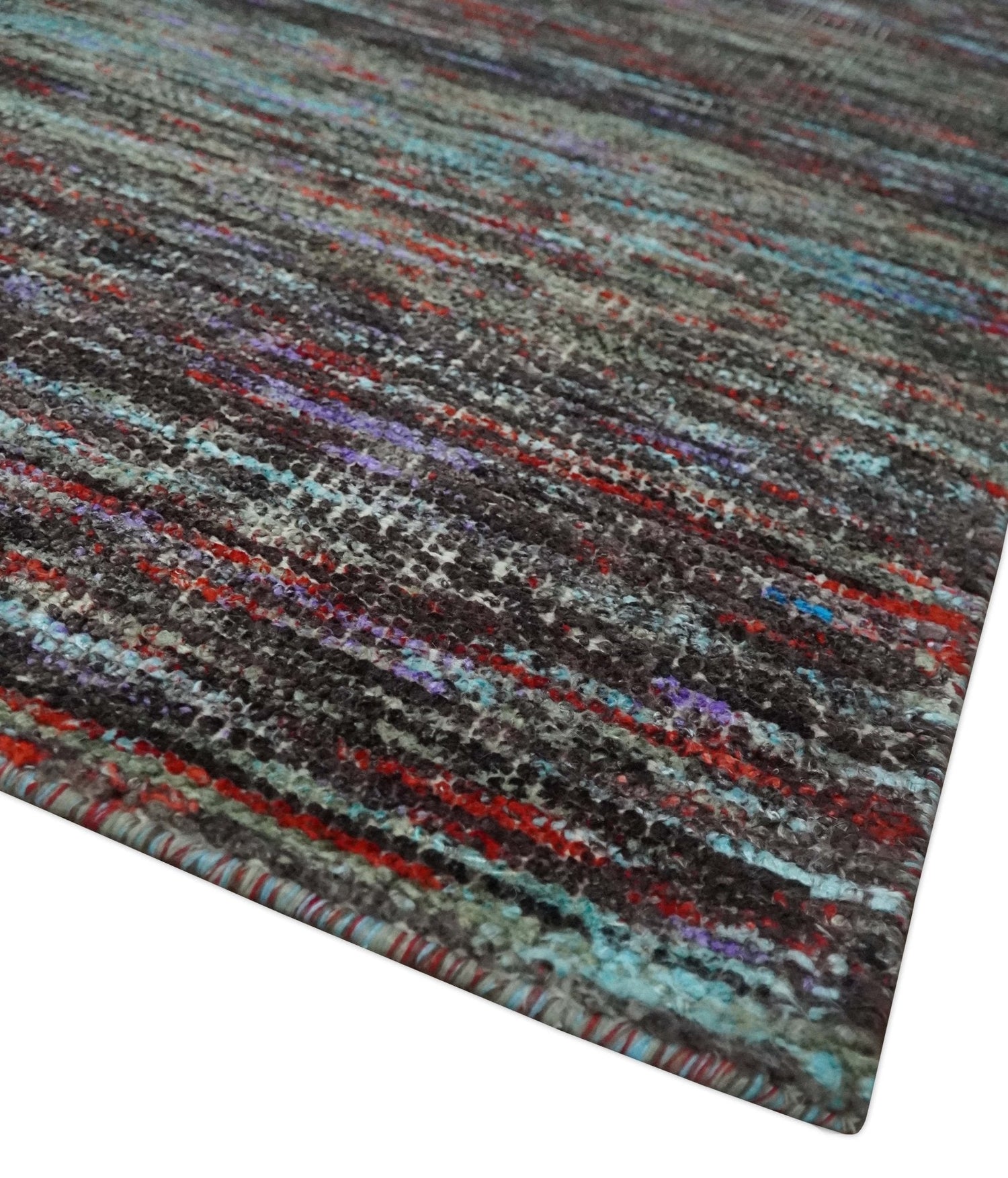 This modern, abstract rug features vibrant colors of maroon, violet, blue, and charcoal, skillfully hand knotted and flat woven in soft wool. With a generous size of 8x11.6, this rug will add a dynamic touch to any room in your home. Elevate your interior design with this eye-catching and expertly crafted piece.
