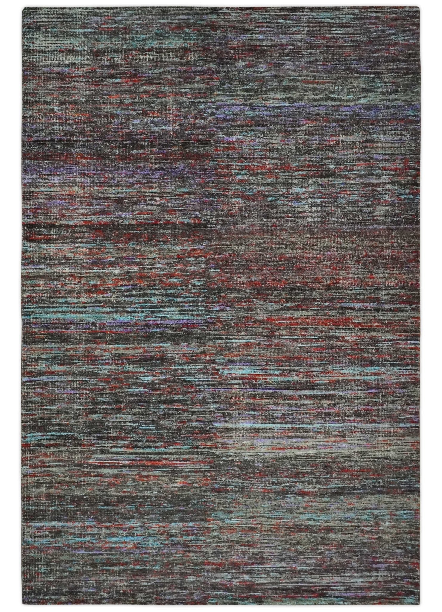 Modern Abstract Vibrant Colorful Maroon, Violet, Blue and Charcoal Hand knotted Flat Woven 8x11.6 wool Area Rug