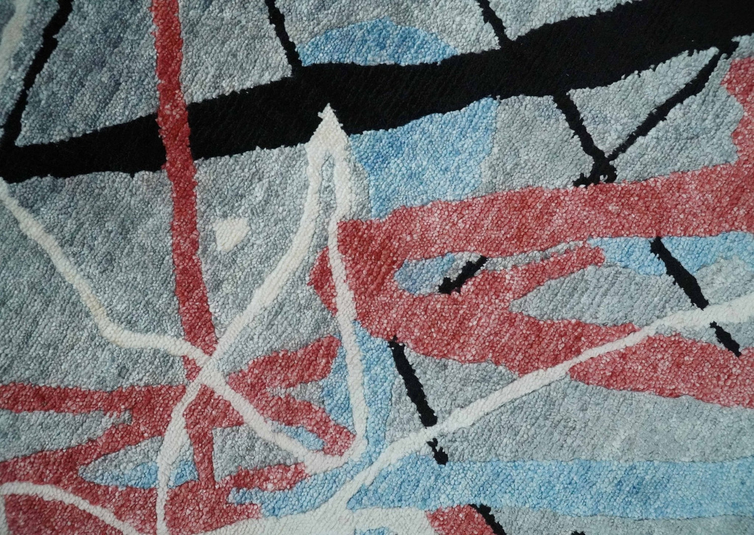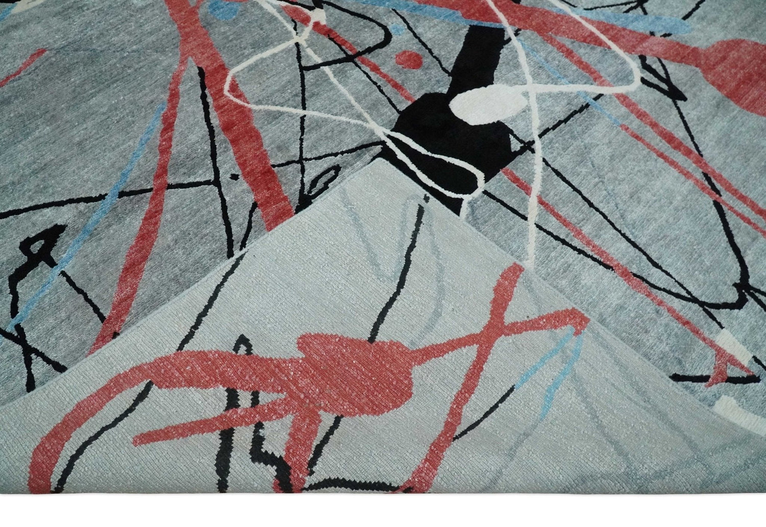 This modern artistic 8x10 area rug is expertly hand-knotted using bamboo silk and features a unique combination of gray, blue, rust, and black tones. With its abstract design, this rug is sure to add sophistication and character to any room.