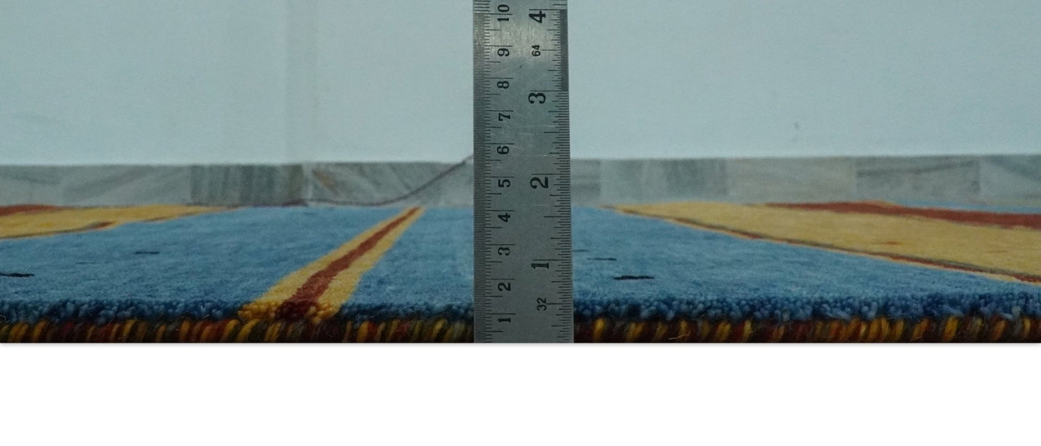 Modern Geometrical Blue, Gold, Brown and Green Stripes Design Hand loom 4.6x7 wool Area Rug - 4.6x7 is backordered and will ship as soon as it is back in stock.