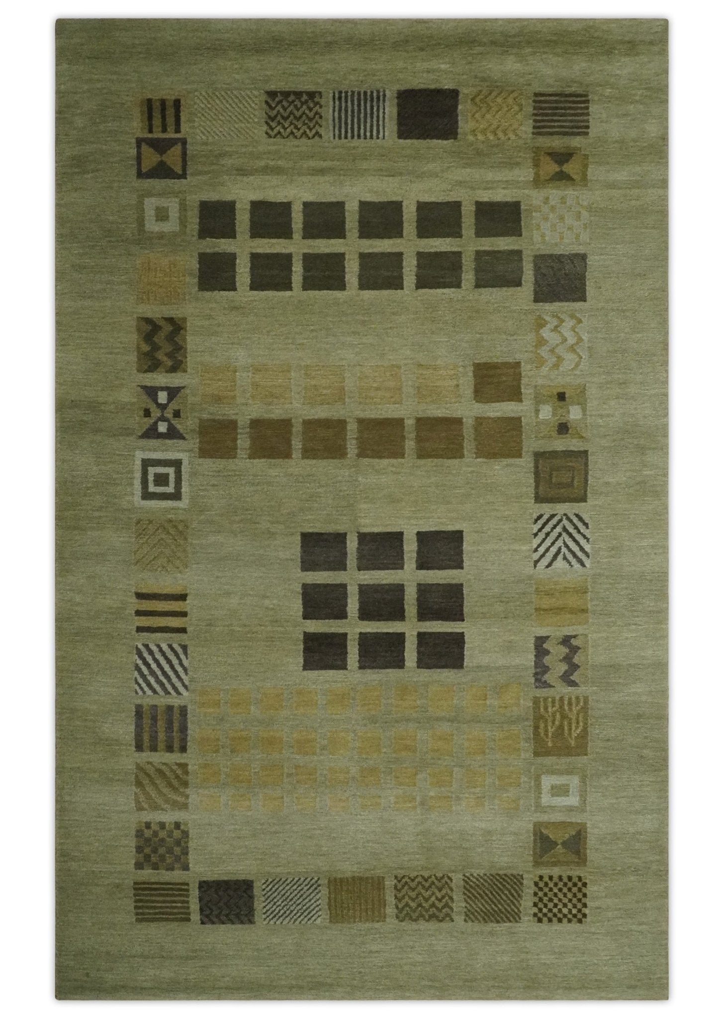 Modern Geometrical Green, Charcoal and Brown Hand loom 5x8 wool Area Rug