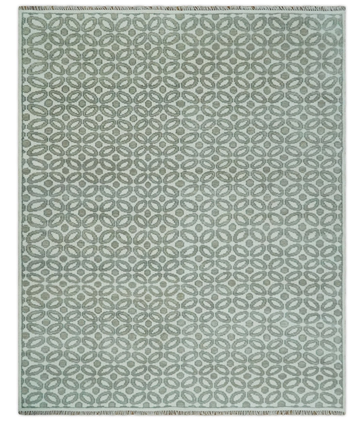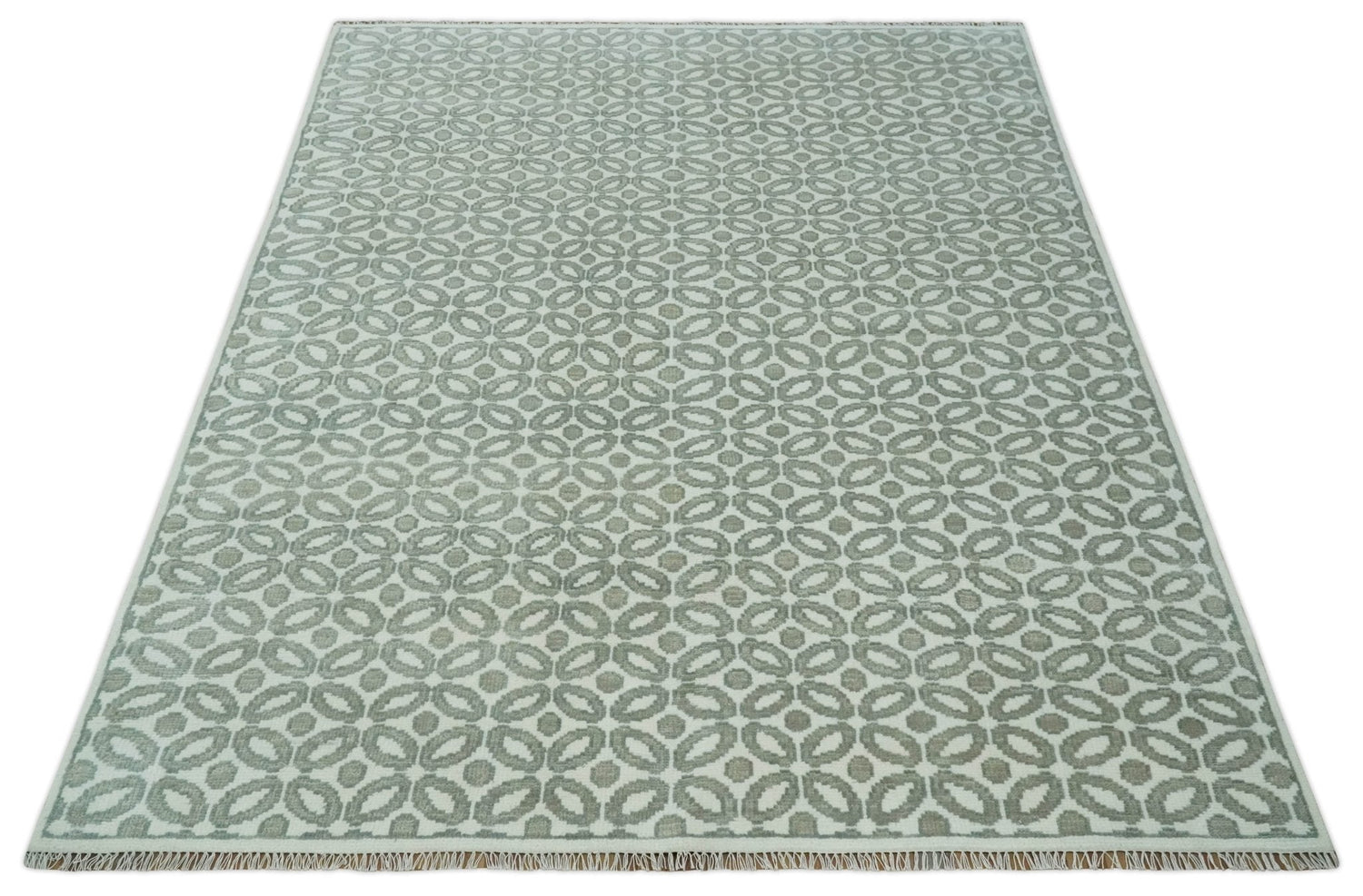 Modern Geometrical Ivory, Teal and Brown Hand Knotted 8x10 wool Area Rug