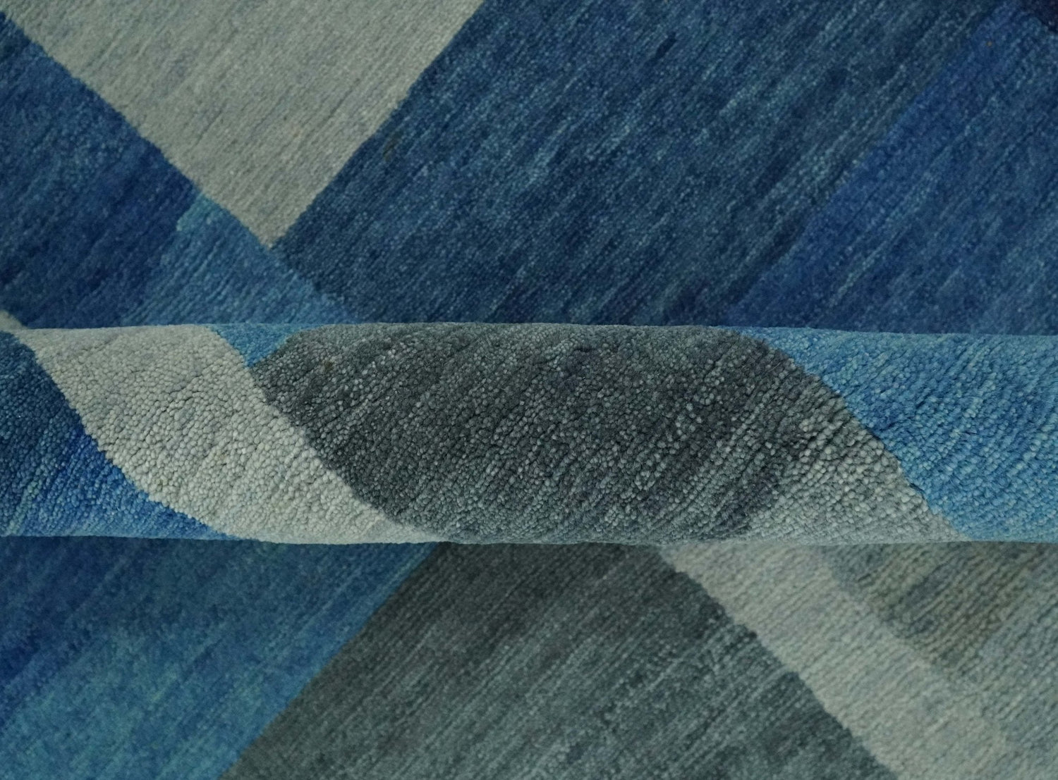 Modern Geometrical Silver, Blue, and Charcoal Hand Knotted 6x9 Wool and Art Silk Area Rug - 6x9 is backordered and will ship as soon as it is back in stock.