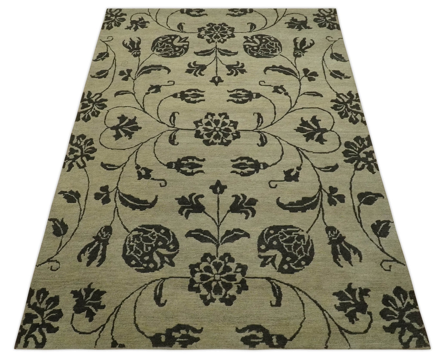 Olive and Dark green Hand Knotted 4x6 Floral Wool and Silk Area Rug