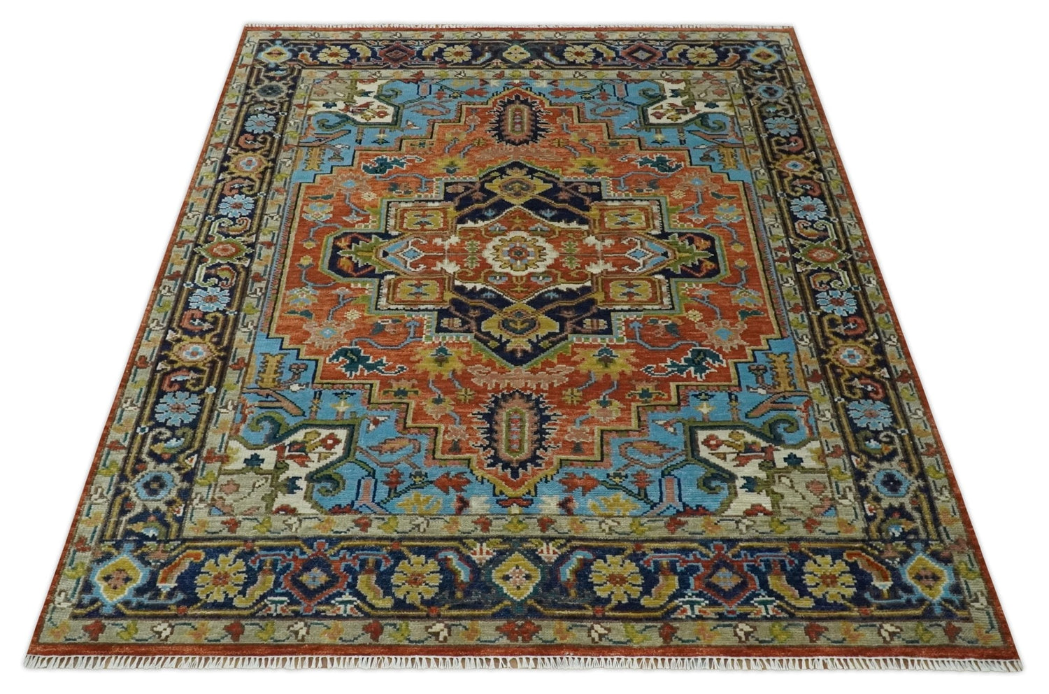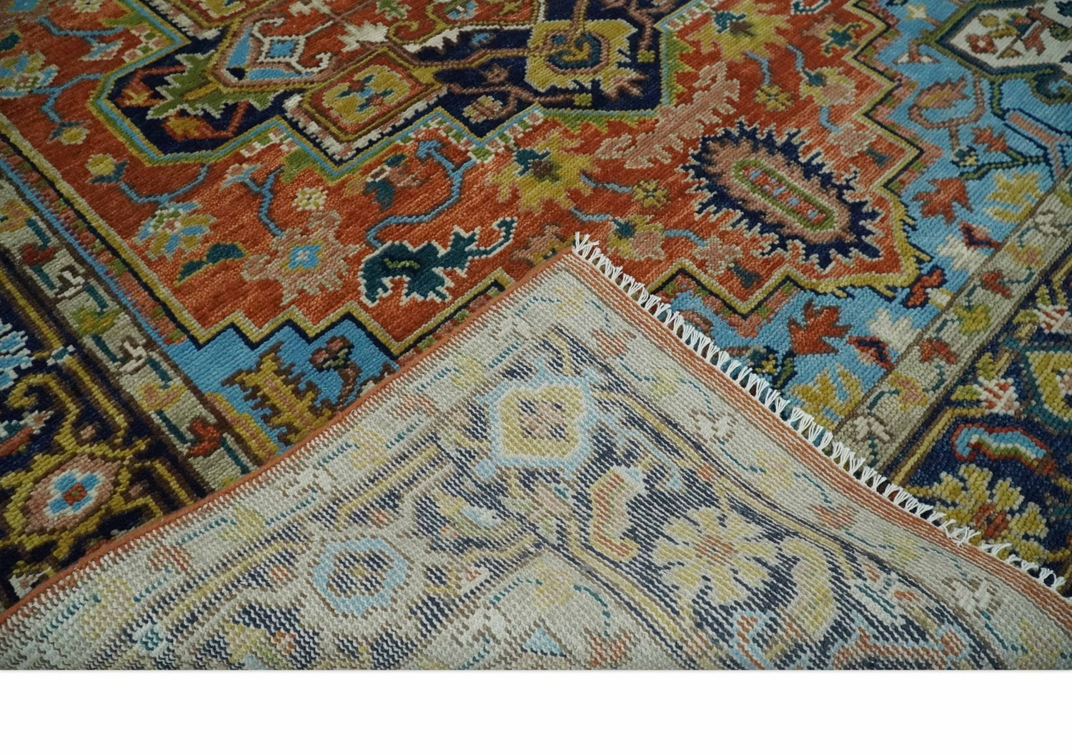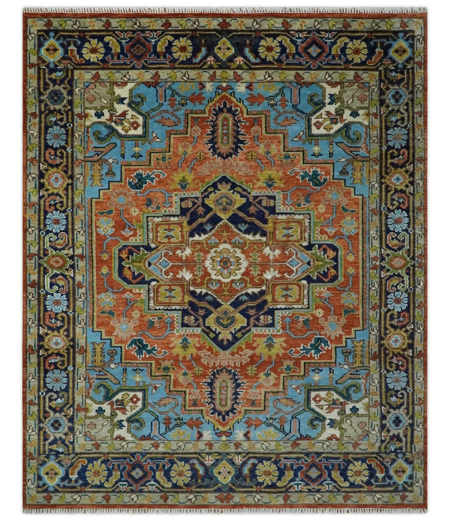 Ready to Ship 8x10 Rust and Blue Traditional Hand Knotted Wool Area Rug
