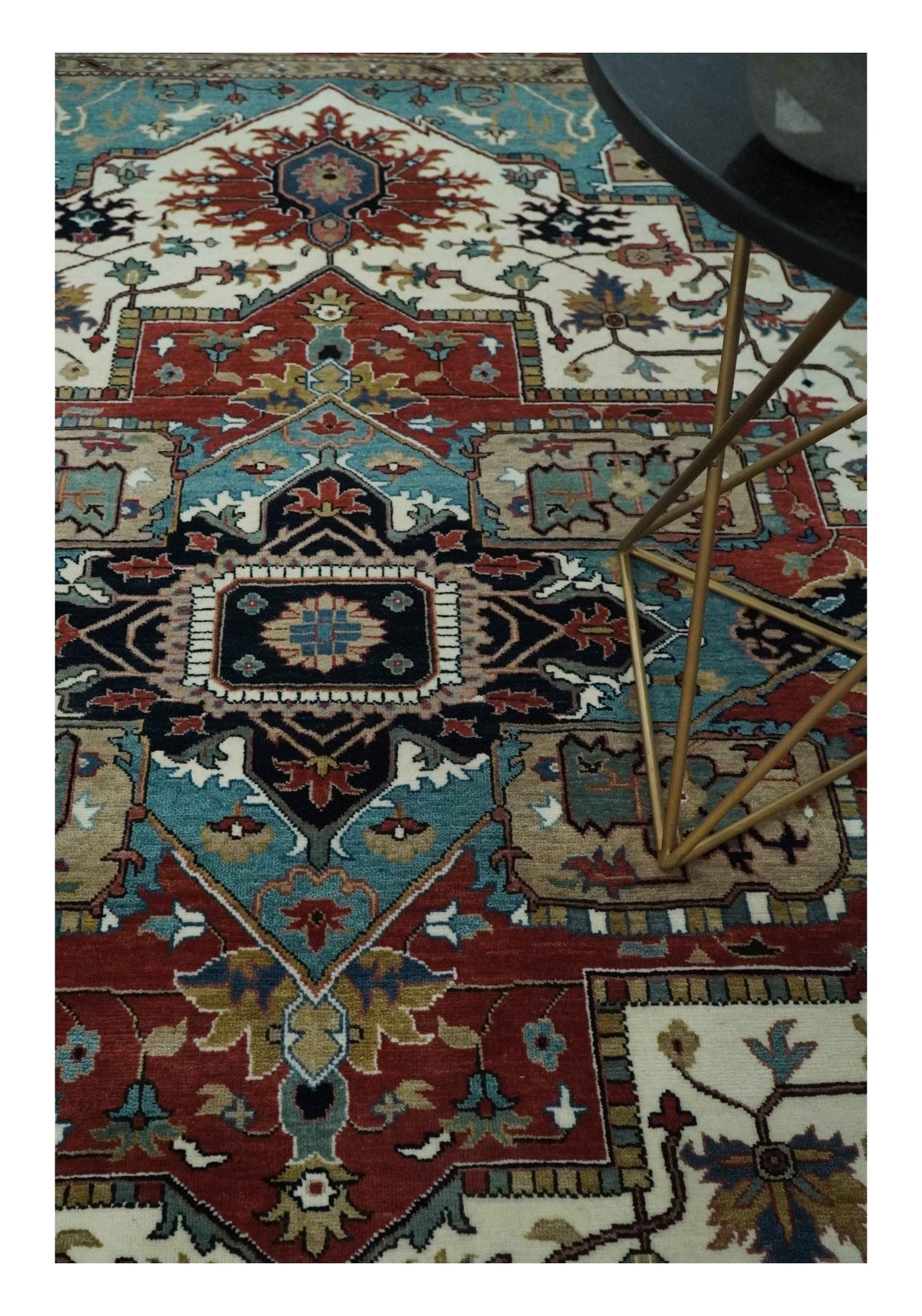 This 8x10 traditional Heriz Serapi wool area rug features a classic ivory, blue and rust color palette, skillfully hand-knotted to create an elegant and timeless piece, perfect for any living room, bedroom or kid's space.