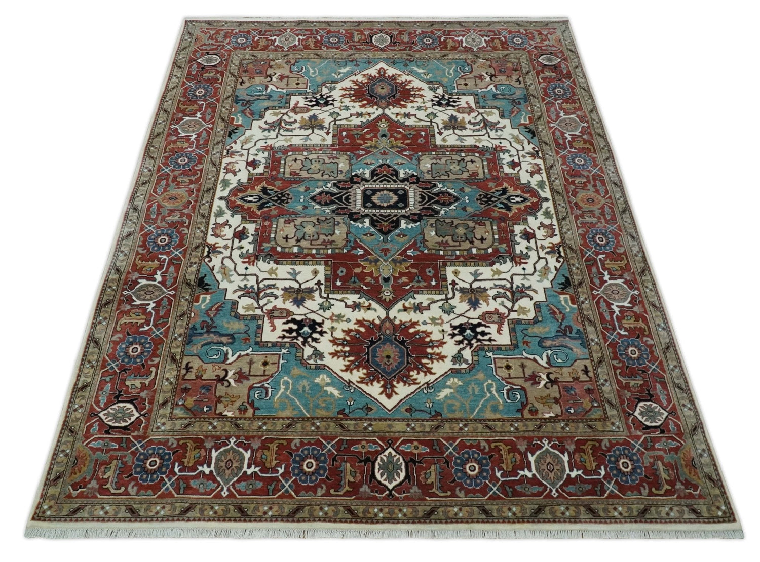 Ready to Ship Blue, Rust and Ivory 8x10 Hand knotted Traditional Wool Area Rug