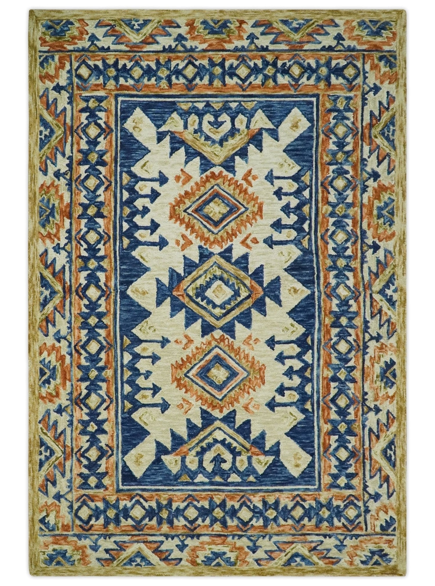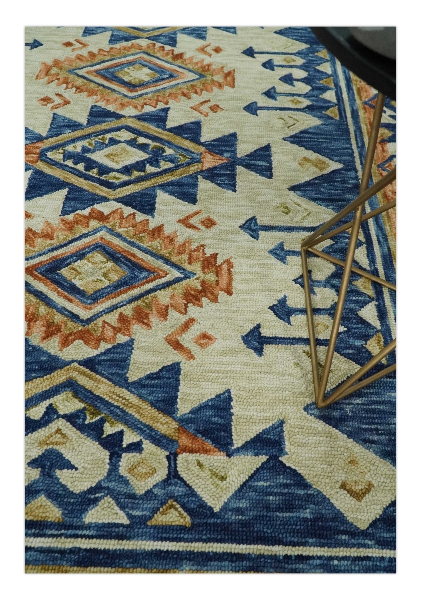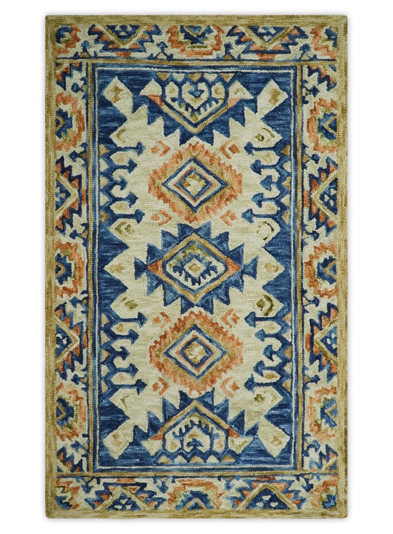Ready To Ship Bohemian Southwestern Hand Tufted Blue, Gold and Beige Wool Rug