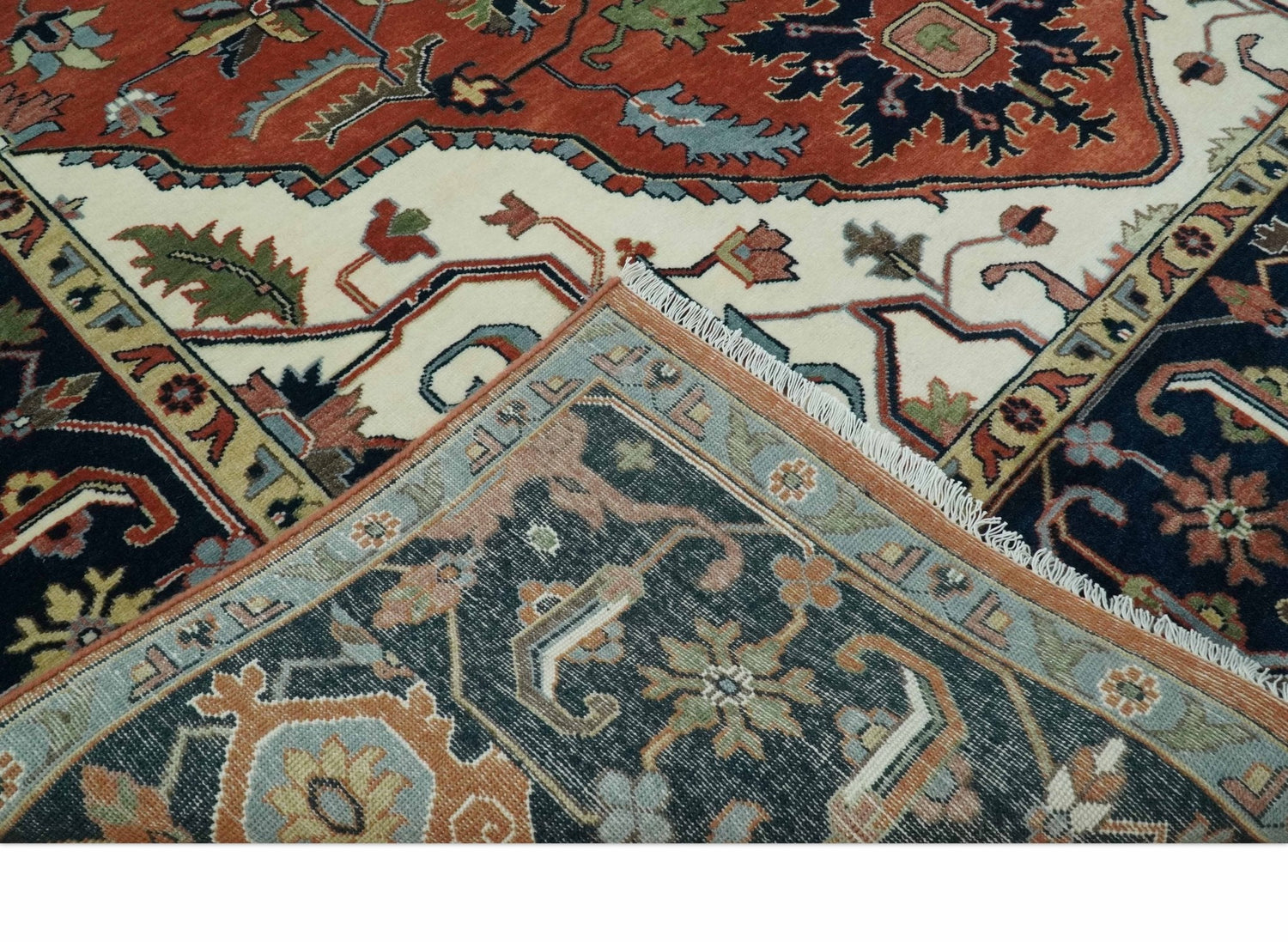 Rust, Ivory and Blue Fine Hand Knotted Traditional Heriz 9x12 wool area rug - 9x12 is backordered and will ship as soon as it is back in stock.