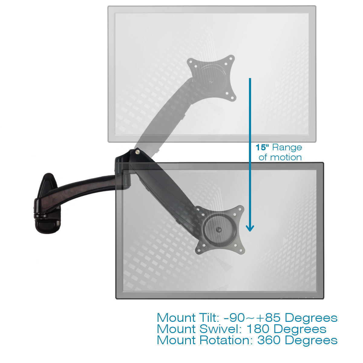 Ergonomically Correct The PopUp monitor arm provides a full range of motion and precise positioning to ensure proper ergonomics to maximize comfort and minimize eye, neck and back strain. With a touch of your finger, you can move your monitor up or down a full 14 to switch from sitting to standing. 90 Tilt means you can point your monitor at the ceiling or floor, and 180 Swivel means you will always face your monitor head-on, even with 2 screens. You can adjust the top of your monitor from 12 up to 39 above your desk (for a 12 high monitor), so even if you are 6 4 you can stand and view your screen comfortably.