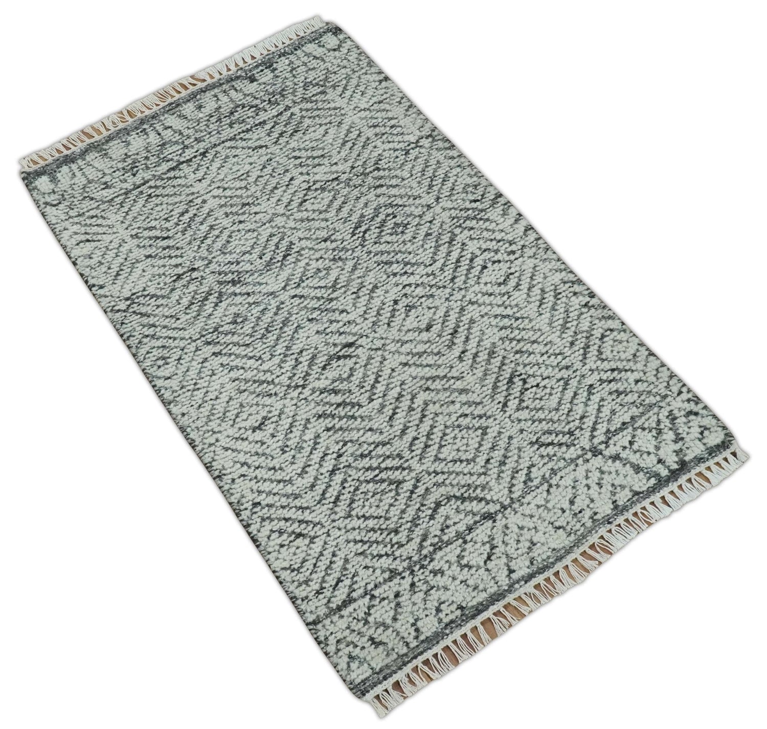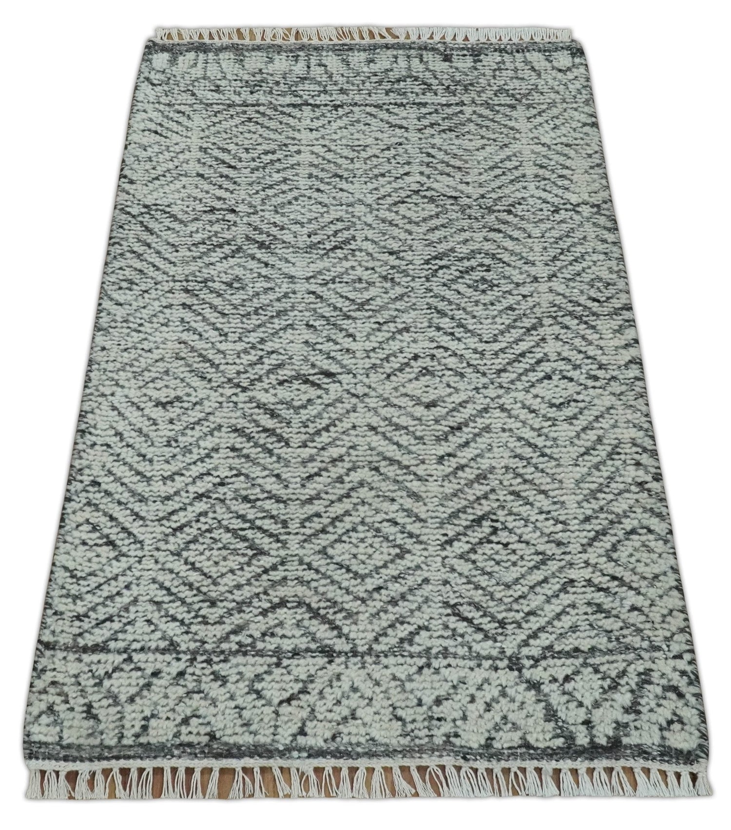 Small 2x3 Hand Knotted Ivory and Charcoal Tribal Design Wool Rug