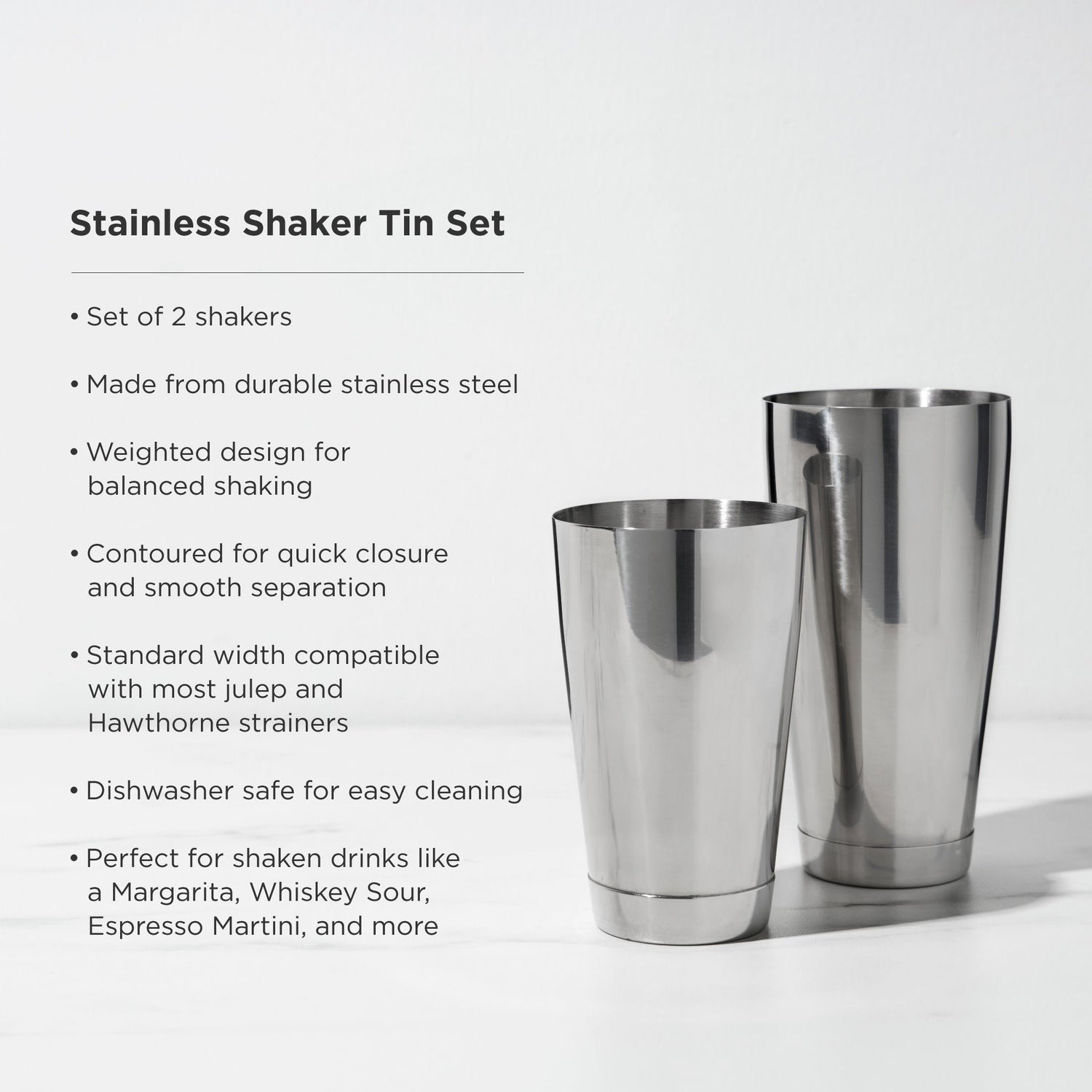Our tight-fitting professional-grade Boston shaker tins are cast from stainless steel and precisely weighted to achieve perfect balance. The 28 oz. and 18 oz. vessels are carefully contoured for the quickest closure and smoothest separation.