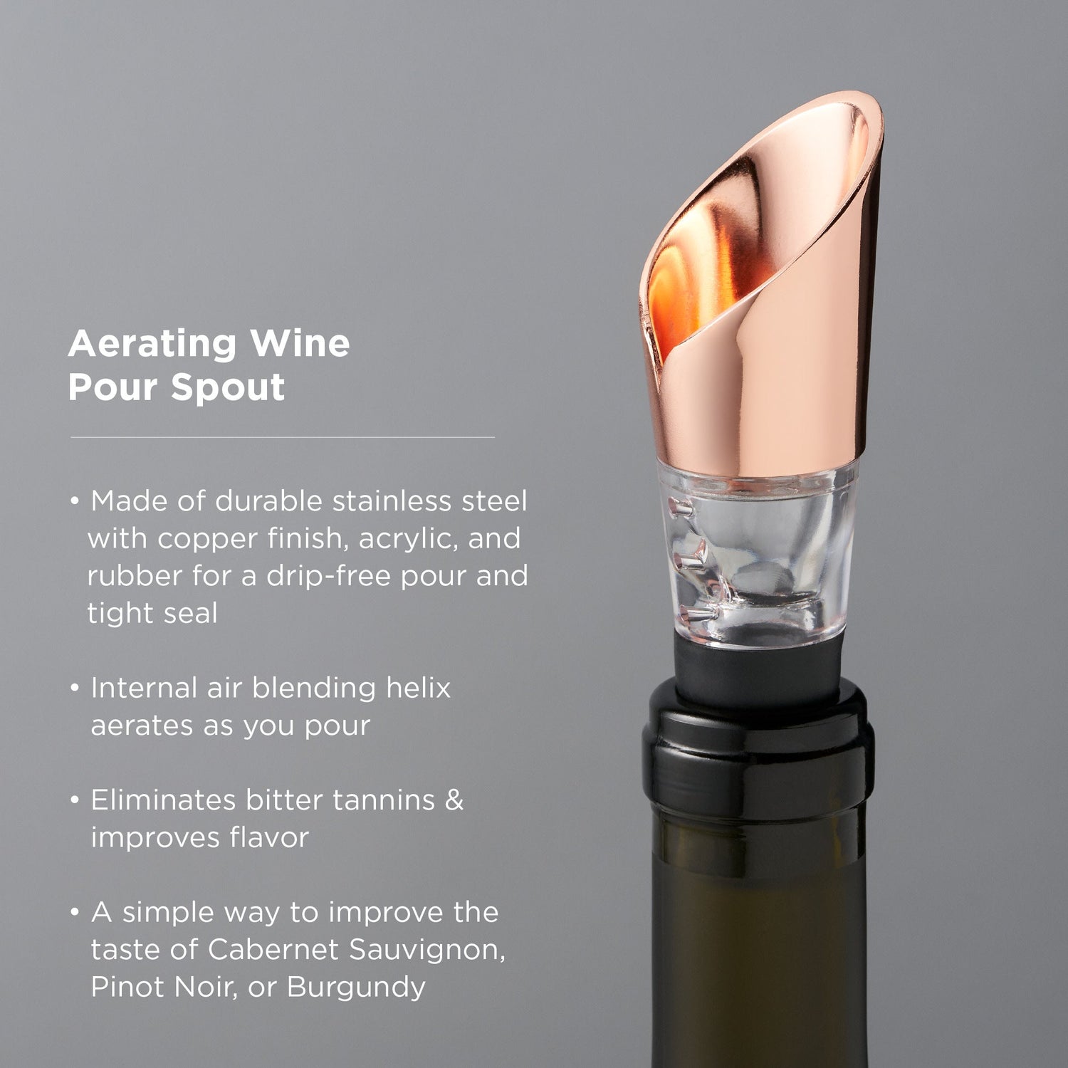Time is money best spent on great wine, rather than waiting for it to decant. Instead, use our aerating spout's air-blending helix to let the vintage breathe as you pour. Now, sit back and relish that full flavor.