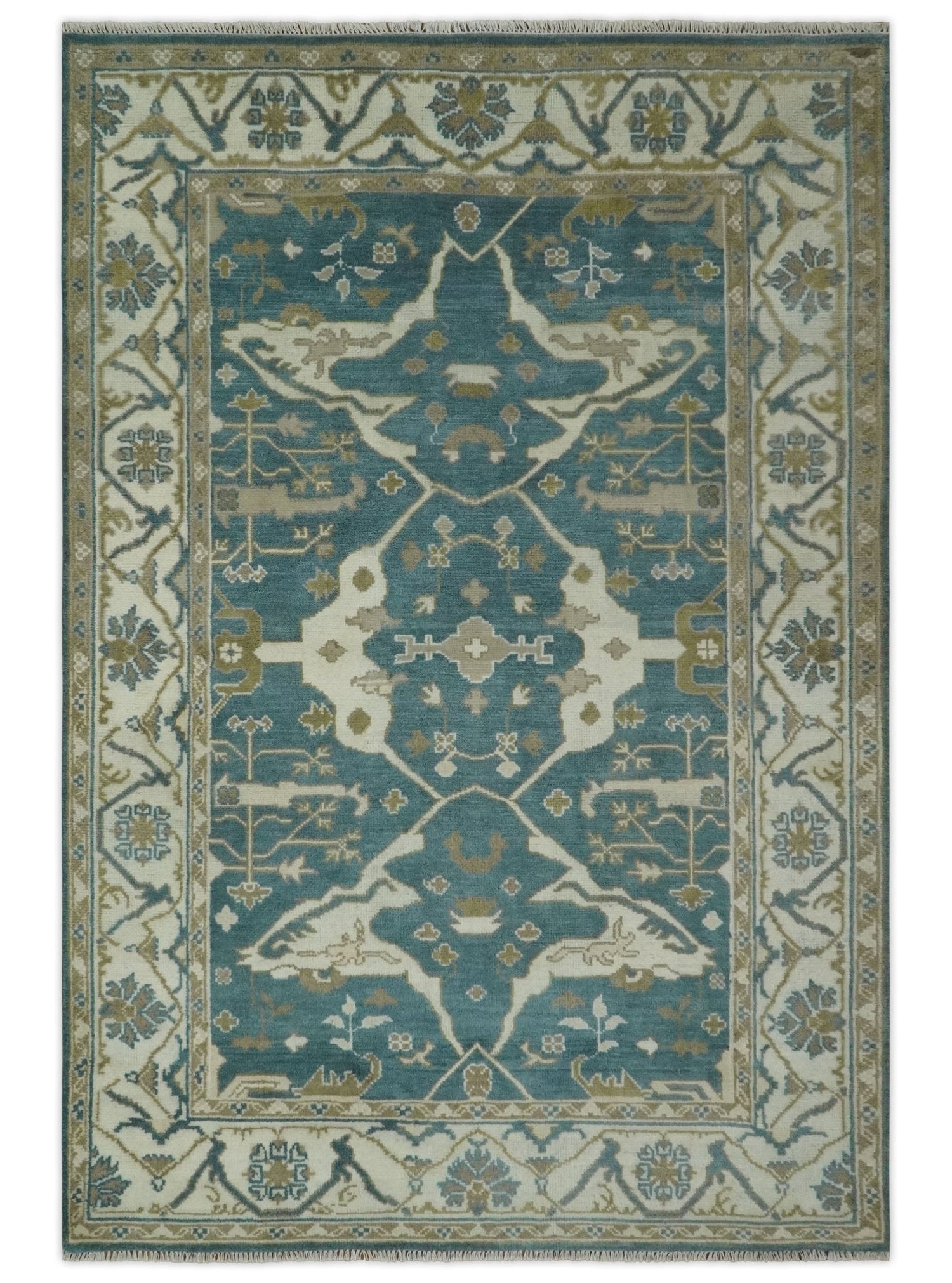Teal, Ivory and Olive 6x9 Hand Knotted Oriental Oushak wool area rug