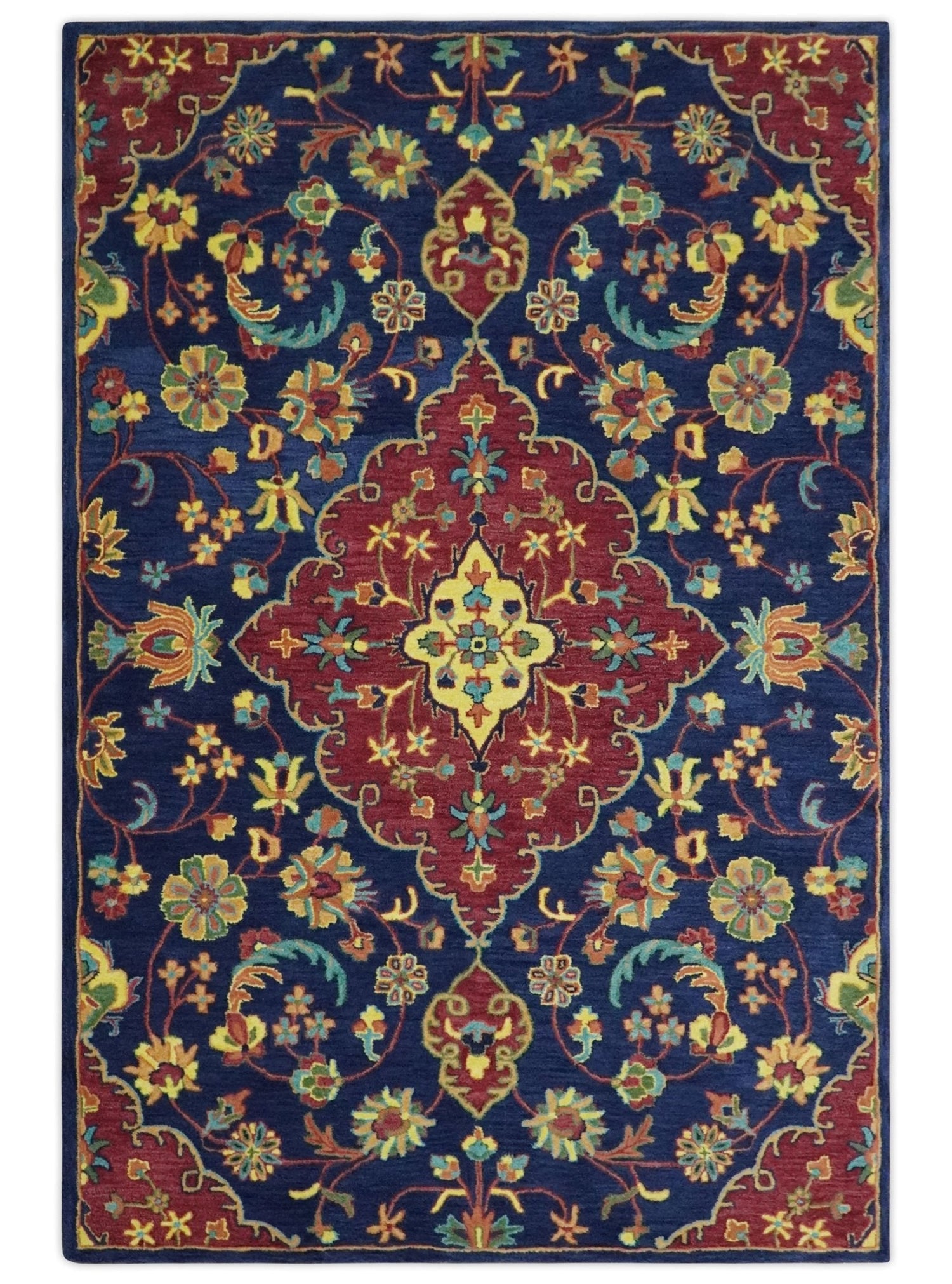 Traditional Blue and Red Hand Tufted Turkish Design Wool Area Rug
