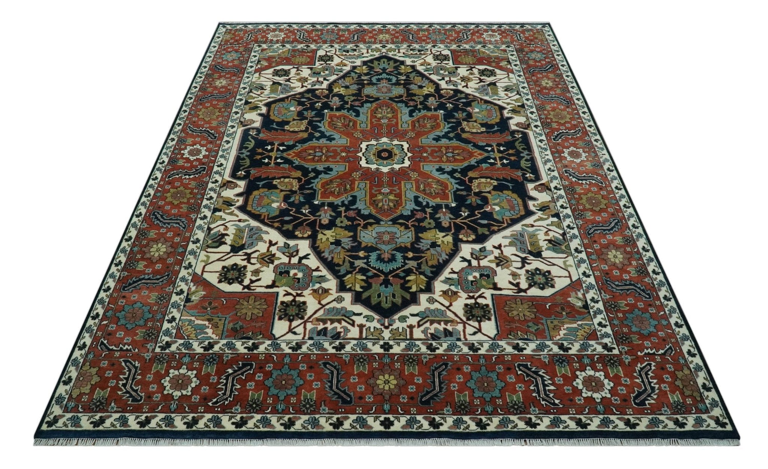 Traditional Floral Blue, Ivory and Rust Hand Knotted 9x12 wool area rug