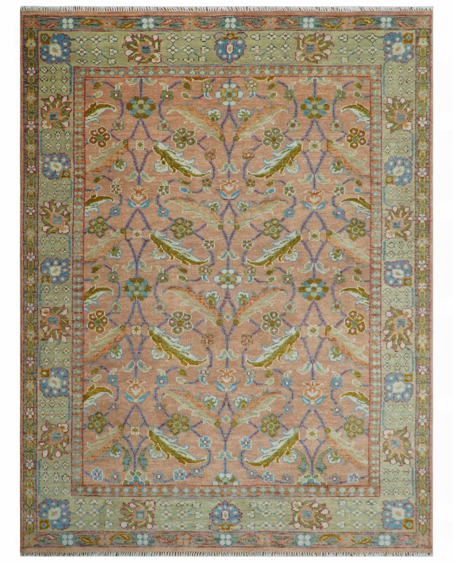 Traditional Floral Peach and Green Hand Knotted Custom Made wool area rug