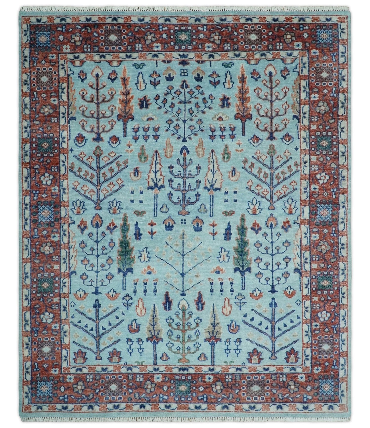 Tree of Life 8x10 Hand Knotted Blue and Rust Traditional Persian Vintage Oushak Wool Rug | TRD2747810S