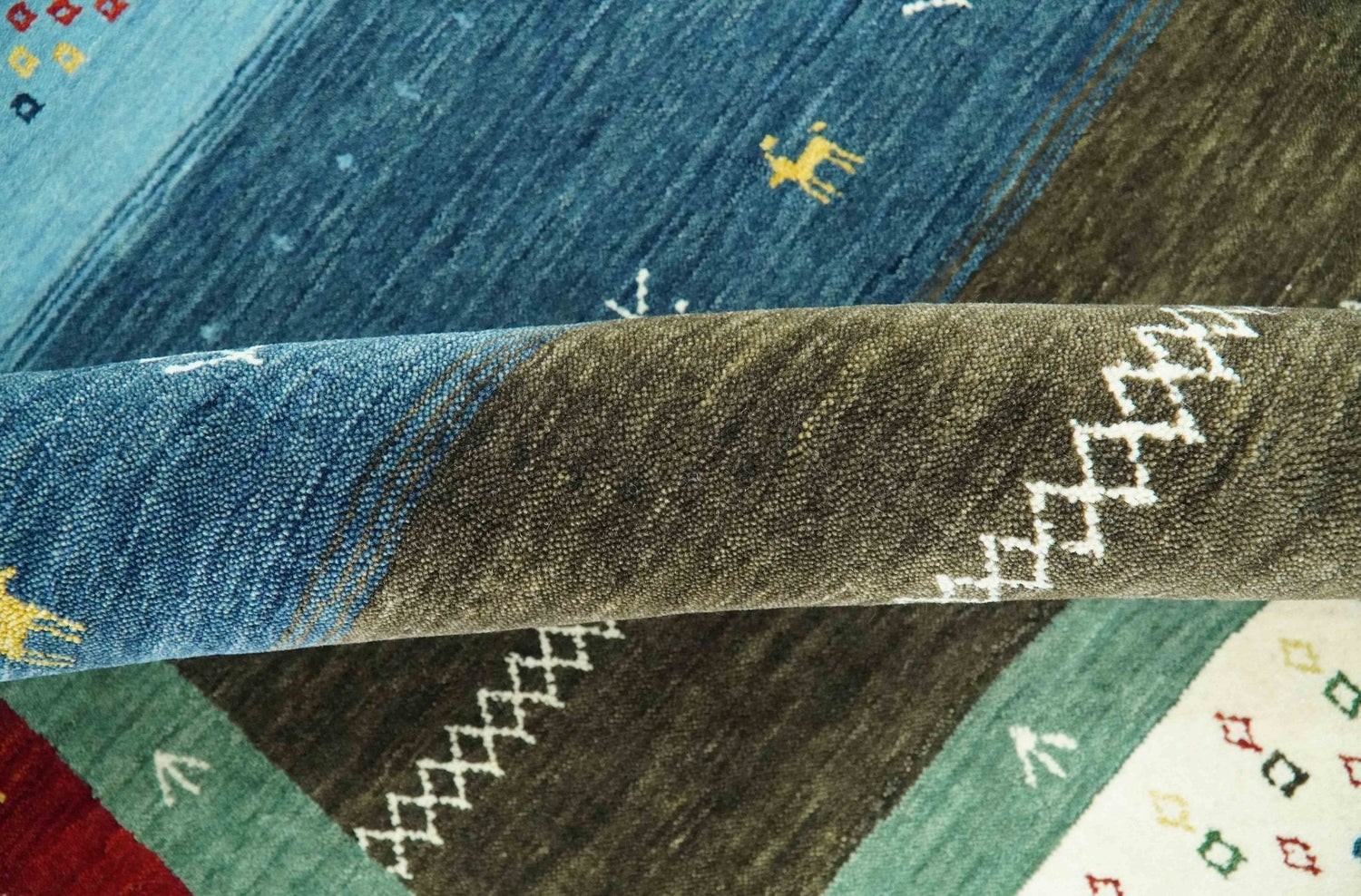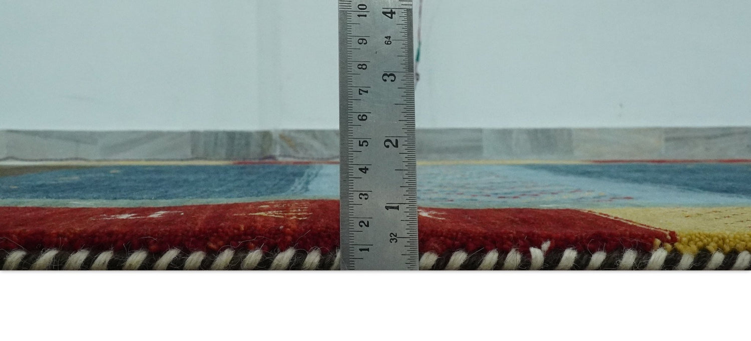 Tribal Gabbeh Blue, Gold, Maroon and Ivory Stripes design Traditional Hand loom 4.6x7 Wool Area Rug - 4.6x7 is backordered and will ship as soon as it is back in stock.